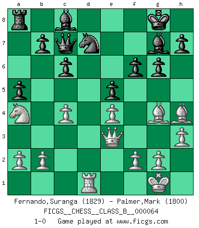 Last move : 1-0 2009 March 3 10:7:22 [Event "FICGS__CHESS__CLASS_B__000064"] [Site "FICGS"] [Date "2008.12.16"] [Round "1"] [White "Fernando,Suranga"] [Black "Palmer,Mark"] [Result "1-0"] [WhiteElo "1829"] [BlackElo "1800"] 1.d4 Nf6 2.c4 g6 3.Nc3 Bg7 4.e4 d6 5.Nf3 O-O 6.h3 Nbd7 7.Bg5 c6 8.Be2 a5 9.O-O e5 10.dxe5 dxe5 11.Qd6 Re8 12.Rfd1 Bf8 13.Qd2 Qc7 14.Nh2 Re6 15.Ng4 Nxg4 16.Bxg4 Rd6 17.Qe3 Bg7 18.Rxd6 Qxd6 19.Rd1 Qc7 20.Na4 f6 21.Bh4 1-0 King's Indian : 5.Nf3 Kingside Castling by player Black (move 5) Kingside Castling by player White (move 9) Player White won this chess game. Follow this game move after move (download)By playing at Chess then, we may learn: First: Foresight... Second: Circumspection... Third: Caution... And lastly, we learn by Chess the habit of not being discouraged by present bad appearances in the state of our affairs, the habit of hoping for a favorable chance, and that of persevering in the secrets of resources. (Benjamin Franklin) Ein Großmeister muß tausende Partien in seinem Kopf speichern, denn diese sind für Ihn, was die Worte der Muttersprache für gewöhnliche Leute sind, oder Noten für Musiker... (Garry Kasparov) El Ajedrez es un expediente tonto que hace creer a la gente inactiva que hacen una cosa muy astuta cuando solamente estan perdiendo su tiempo. (George Bernard Shaw) Mon pion favori sur ma case favorite ! Bronstein en parlant d'un coup de pion en h5 quand il avait les Noirs. May the force be with you. (Han Solo in Star Wars ep.4)