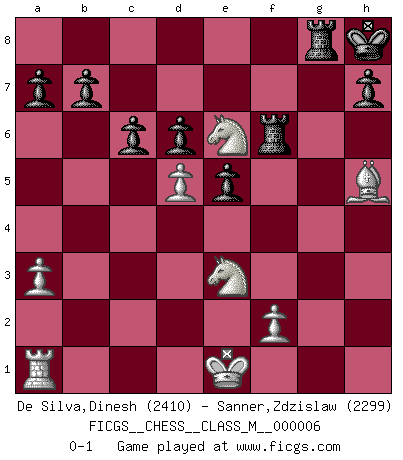 Last move : 0-1 2007 February 3 2:25:47 [Event "FICGS__CHESS__CLASS_M__000006"] [Site "FICGS"] [Date "2006.08.22"] [Round "1"] [White "De Silva,Dinesh"] [Black "Sanner,Zdzislaw"] [Result "0-1"] [WhiteElo "2410"] [BlackElo "2299"] 1.d4 Nf6 2.c4 g6 3.Nc3 Bg7 4.e4 O-O 5.Nf3 d6 6.h3 e5 7.d5 Na6 8.Bg5 Qe8 9.g4 Nd7 10.Rg1 Kh8 11.Be2 Ndc5 12.a3 f5 13.gxf5 gxf5 14.exf5 Bxf5 15.Nh4 Bc8 16.Bh5 Nd3+ 17.Kd2 Nxb2 18.Qe2 Nxc4+ 19.Ke1 Qd7 20.Qxc4 Qxh3 21.Ne4 Nc5 22.Nxc5 Qh2 23.Rf1 Bh3 24.Ne6 Bxf1 25.Qxf1 Bf6 26.Qg2 Qxg2 27.Bxf6+ Rxf6 28.Nxg2 c6 29.Ne3 Rg8 0-1 King's Indian : 4.e4 Kingside Castling by player Black (move 4) Player Black won this chess game. Follow this game move after move (download)Adequate compensation for a sacrifice is having a sound combination leading to a winning position; adequate compensation for a blunder is having your opponent snatch defeat from the jaws of victory. (Bruce A. Moon) Schach ist gnadenlos. Du mußt bereit sein zu töten. (Nigel Short) El Ajedrez es en su esencia, un juego. En su forma, un arte. Y en su ejecución, una ciencia. (Baron Tassilo) Les pièces de l'échiquier étaient impitoyables. Elles le retenaient, elles l'absorbaient. Il y avait de l'horreur en cela, mais aussi une harmonie unique. Car, qu'y a-t-il dans le monde, à part les échecs ? (V. Nabokov) Nothing is more important for teaching us to understand the concepts we have than constructing fictitious ones. (Ludwig Wittgenstein)