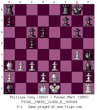 Last move : 0-1 2008 December 28 19:57:6 [Event "FICGS__CHESS__CLASS_B__000064"] [Site "FICGS"] [Date "2008.12.16"] [Round "1"] [White "Phillips,Tony"] [Black "Palmer,Mark"] [Result "0-1"] [WhiteElo "1800"] [BlackElo "1800"] 1.e4 c5 2.Nf3 Nc6 3.Nc3 d6 4.Be2 Nf6 5.b3 g6 6.Bb2 Bg7 7.Nd5 e5 8.Ng5 Nxd5 9.exd5 Qxg5 10.dxc6 bxc6 11.g3 Bh3 12.Bc1 e4 13.g4 Bxa1 14.c3 O-O 15.Ba3 e3 16.fxe3 Qh4+ 0-1 Sicilian defense Kingside Castling by player Black (move 14) Player Black won this chess game. Follow this game move after move (download)I look one move ahead... the best ! (Siegbert Tarrasch) Ich möchte Schüler heranbilden, die das Vermögen haben, selbst zu denken und Kritik zu üben. (Emanuel Lasker) El Rey es una pieza de pelea. ¡Usenlo!. (Wilhelm Steinitz) Roi des jeux et jeu des rois, les échecs portent en eux un sentiment d'infini. Ils donnent à celui qui s'est efforcé d'en approfondir les arcanes l'impression de n'être pas à la mesure de l'homme; en fait, ils constituent un résumé de l'univers, un microcosme, et figurent cette grande échelle qui, dans les plans de la lumière descend jusqu'à la matière, qui des abîmes insondables remonte jusqu'en l'infini de Dieu. (Pyrame) Perfection is achieved, not when there is nothing more to add, but when there is nothing left to take away. (Antoine de Saint-Exupéry)