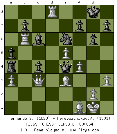 Last move : 1-0 2009 January 17 19:41:5 [Event "FICGS__CHESS__CLASS_B__000064"] [Site "FICGS"] [Date "2008.12.16"] [Round "1"] [White "Fernando,Suranga"] [Black "Perevozchikov,Vjacheslav"] [Result "1-0"] [WhiteElo "1829"] [BlackElo "1901"] 1.d4 Nf6 2.c4 g6 3.Nc3 d5 4.Bf4 Bg7 5.Rc1 Nh5 6.Bd2 dxc4 7.e3 O-O 8.Bxc4 e5 9.dxe5 Nc6 10.Nf3 Nxe5 11.Nxe5 Bxe5 12.Be2 Ng7 13.O-O c6 14.f4 Bf6 15.Ne4 Bxb2 16.Rb1 Re8 17.Rxb2 Rxe4 18.Qb3 Nf5 19.Qc3 Qe7 20.Re1 a5 21.Bd3 Ra4 22.e4 Nd4 23.Be3 Qd6 24.e5 Qd5 25.Rd2 Be6 26.a3 c5 27.Rb1 Bd7 28.Rb6 Bc6 29.Bf1 Qe4 30.Rf2 Rd8 31.h3 c4 32.Rd2 Ne6 33.Rxd8+ 1-0 King's Indian defense, 3.Nc3 Kingside Castling by player Black (move 7) Kingside Castling by player White (move 13) Player White won this chess game. Follow this game move after move (download)A big shock; the best chess player in history has passed away. (Lajos Portisch, about Bobby Fischer's death) Ich moechte nie einem Club beitreten, der Leute wie mich als Mitglieder aufnimmt. (Woody Allen) Preferería tener un Peón que un dedo. (Reuben Fine) La tactique, c'est ce que vous faites quand il y a quelque chose à faire; la stratégie, c'est ce que vous faites quand il n'y a rien à faire. (Savielli Tartacower) If you are good, you will be assigned all the work. If you are really good, you will get out of it. (Dan Rotaru)