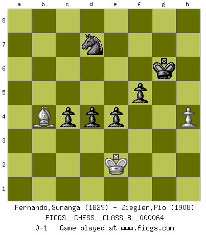 Last move : 0-1 2009 June 15 19:9:35 [Event "FICGS__CHESS__CLASS_B__000064"] [Site "FICGS"] [Date "2008.12.16"] [Round "1"] [White "Fernando,Suranga"] [Black "Ziegler,Pio"] [Result "0-1"] [WhiteElo "1829"] [BlackElo "1908"] 1.d4 Nf6 2.c4 g6 3.Nc3 Bg7 4.e4 d6 5.Be2 O-O 6.Bg5 c5 7.d5 h6 8.Bf4 a6 9.Nf3 b5 10.cxb5 axb5 11.Bxb5 Nxe4 12.Nxe4 Qa5+ 13.Nc3 Bxc3+ 14.bxc3 Qxb5 15.Bxh6 Re8 16.a4 Qc4 17.Nd2 Qxd5 18.O-O Bf5 19.c4 Qd4 20.a5 Nc6 21.Be3 Qb2 22.a6 Qb6 23.Qa4 Reb8 24.Bh6 Nb4 25.a7 Rb7 26.Qb3 Nc2 27.Qxb6 Rxb6 28.Ra2 Kh7 29.Bg5 Rb7 30.g4 Nb4 31.Ra4 Bxg4 32.Rfa1 f6 33.Be3 Bd7 34.Ra5 Nc6 35.R5a3 R8xa7 36.Rxa7 Rxa7 37.Rxa7 Nxa7 38.Kf1 Bf5 39.Ke2 Nc6 40.h4 Ne5 41.Kd1 Bd3 42.Bf4 Nd7 43.Kc1 Nb6 44.Kb2 Bxc4 45.Kc2 e5 46.Be3 Bd5 47.f3 Kg7 48.Kd3 Bc6 49.Ne4 Bxe4+ 50.fxe4 f5 51.exf5 gxf5 52.Bg5 c4+ 53.Ke2 d5 54.Bd8 Nd7 55.Bc7 d4 56.Bd6 Kg6 57.Bb4 e4 0-1 King's Indian : Averbakh, 6...c5 Kingside Castling by player Black (move 5) Kingside Castling by player White (move 18) 10 pieces endgame at move 51 : White KBPP , Black KNPPPP WHITE : King + 1 Bishop 2 Pawns BLACK : King + 1 Knight 4 Pawns 9 pieces endgame at move 51 : White KBP , Black KNPPPP WHITE : King + 1 Bishop 1 Pawn BLACK : King + 1 Knight 4 Pawns Player Black won this chess game. Follow this game move after move (download)You need not play well - just help your opponent to play badly. (Genrikh Chepukaitis) Ich verachte Kasparow. (Viktor Kortschnoi) Fischer deseaba darle a los Rusos una sopa de su propia medicina. (Larry Evans) Ce qui caractérise les parties de combat, c'est que si le défenseur a constamment de difficiles problèmes à résoudre, l'attaquant doit chercher sans relâche de nouvelles possibilités d'attaque. (Koblentz) Waiting for chance ? Play in casinos. (FICGS proverb)