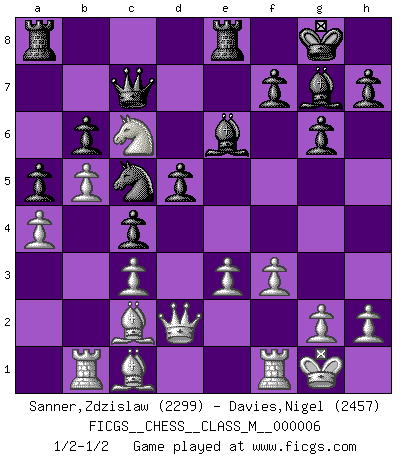 Last move : 1/2-1/2 2006 September 24 9:33:39 [Event "FICGS__CHESS__CLASS_M__000006"] [Site "FICGS"] [Date "2006.08.22"] [Round "1"] [White "Sanner,Zdzislaw"] [Black "Davies,Nigel"] [Result "1/2-1/2"] [WhiteElo "2299"] [BlackElo "2457"] 1.d4 d5 2.Nf3 Nf6 3.e3 c5 4.c3 Nbd7 5.Nbd2 g6 6.Bd3 Bg7 7.O-O O-O 8.b4 c4 9.Bc2 a5 10.b5 Qc7 11.a4 e5 12.dxe5 Nxe5 13.Nxe5 Qxe5 14.Nf3 Qc7 15.Nd4 Re8 16.f3 Nd7 17.Rb1 b6 18.Qd2 Nc5 19.Nc6 Be6 1/2-1/2 Queen's pawn game Kingside Castling by player White (move 7) Kingside Castling by player Black (move 7) This chess game ended in a draw. Follow this game move after move (download)After a bad opening, there is hope for the middle game. After a bad middle game, there is hope for the endgame. But once you are in the endgame, the moment of truth has arrived. (Edmar Mednis) Schach wird sich dank seiner hohen kulturellen Tradition immer durchsetzen. In näherer Zukunft womöglich sogar als Gegenreaktion auf die maßlose Reizüberflutung im Freizeit- und Spielbereich. (Garry Kasparov) Solo puedes ser bueno en el Ajedrez si amas al juego. (Bobby Fischer) On peut tirer plus d'utilité d'une partie perdue que de 100 parties gagnées. (Capablanca) Humor is by far the most significant activity of the human brain. (Edward De Bono)