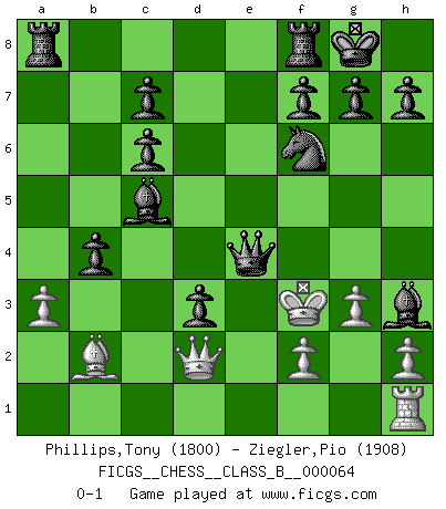 Last move : 0-1 2009 January 9 13:59:17 [Event "FICGS__CHESS__CLASS_B__000064"] [Site "FICGS"] [Date "2008.12.16"] [Round "1"] [White "Phillips,Tony"] [Black "Ziegler,Pio"] [Result "0-1"] [WhiteElo "1800"] [BlackElo "1908"] 1.e4 e5 2.Nf3 Nc6 3.c3 Nf6 4.Bd3 d5 5.Bb5 dxe4 6.Nxe5 Qd5 7.c4 Qxe5 8.Bxc6+ bxc6 9.Qe2 Bb4 10.a3 Bd6 11.Nc3 O-O 12.b4 a5 13.c5 axb4 14.g3 Bxc5 15.d3 Qxc3+ 16.Qd2 Qxa1 17.Kf1 Bh3+ 18.Ke2 exd3+ 19.Kf3 Qd4 20.Bb2 Qe4+ 0-1 Ponziani : Jaenisch counter-attack Kingside Castling by player Black (move 11) Player Black won this chess game. Follow this game move after move (download)Tactics flow from a superior position. (Bobby Fischer) Die Arbeit ist etwas Unnatürliches. Die Faulheit allein ist göttlich. (Anatole France) La esencia del Ajedrez es pensar acerca de lo que el Ajedrez es. (David Bronstein) Même si l'adversaire joue le coup analysé précédemment, recommencez l'analyse en voyant la nouvelle position. Première règle de Blumenfeld Somewhere in the world there is an epigram for every dilemma. (Hendrik Willem van Loon)