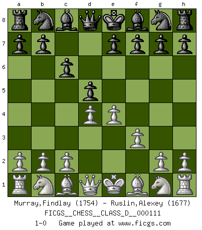 Last move : 1-0 2009 February 1 20:23:42 [Event "FICGS__CHESS__CLASS_D__000111"] [Site "FICGS"] [Date "2008.12.16"] [Round "1"] [White "Murray,Findlay"] [Black "Ruslin,Alexey"] [Result "1-0"] [WhiteElo "1754"] [BlackElo "1677"] 1.e4 c6 2.d4 d5 3.f3 1-0 This chess game has been lost on time (started : 2008.12.16 20:51:1) Caro-Kann : Tartakower (fantasy) variation Player White won this chess game. Follow this game move after move (download)By this measure (on the gap between Fischer & his contemporaries), I consider him the greatest world champion. (Garry Kasparov) Ein Remis kann durch Wiederholung von drei Zügen oder durch einen schlechte Zug erreicht werden. (Savielly Grigorievitsch Tartakower) Nunca antes ha habido un jugador de Ajedrez con tal conocimiento a fondo de las complejidades del juego y una inmensa voluntad absolutamente indomable de ganar. Yo pienso que Fischer es el jugador mas grande que jamás haya existido. (Lisa Lane) Il vaut mieux sacrifier les pièces de l'adversaire. (Xavier Tartacover) Always remember that you are unique; just like everyone else. (Unknown)