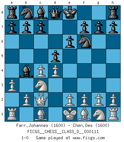 Last move : 1-0 2009 January 27 19:55:51 [Event "FICGS__CHESS__CLASS_D__000111"] [Site "FICGS"] [Date "2008.12.16"] [Round "1"] [White "Farr,Johannes"] [Black "Chen,Des"] [Result "1-0"] [WhiteElo "1600"] [BlackElo "1600"] 1.d4 Nf6 2.c4 e6 3.Nc3 Bb4 4.Qc2 d5 5.a3 1-0 This chess game has been lost on time (started : 2008.12.16 20:51:1) Nimzo-Indian : Classical, Noa variation, 5.a3 Player White won this chess game. Follow this game move after move (download)Some sacrifices are sound; the rest are mine. (Mikhail Tal) Man gibt nur Pakete auf. (Paul Keres) Durante una competencia de Ajedrez, un Maestro de Ajedrez deberá ser una combinación de presa de caza y un Monge. (Alexander Alekhine) Si je n'étais pas joueur d'échecs, je serais le meilleur dans quelque chose d'autre. (Anatoli Karpov) Men should grow up. - Yeah. And dogs should stop licking themselves. It's not gonna happen. (Gregory House to Dr. Cameron, House M.D.)