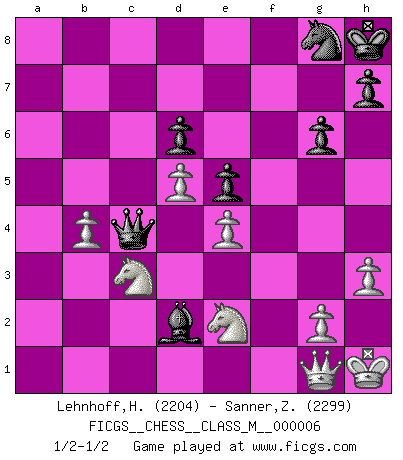 Last move : 1/2-1/2 2006 December 20 9:23:2 [Event "FICGS__CHESS__CLASS_M__000006"] [Site "FICGS"] [Date "2006.08.22"] [Round "1"] [White "Lehnhoff,Heinz-Georg"] [Black "Sanner,Zdzislaw"] [Result "1/2-1/2"] [WhiteElo "2204"] [BlackElo "2299"] 1.d4 Nf6 2.c4 g6 3.Nc3 Bg7 4.e4 O-O 5.f3 d6 6.Be3 Nc6 7.Nge2 a6 8.Qd2 Rb8 9.a3 e5 10.d5 Ne7 11.b4 c6 12.Ng3 cxd5 13.cxd5 Ne8 14.Bd3 f5 15.Ba7 Ra8 16.Bf2 Nf6 17.O-O fxe4 18.fxe4 Ng4 19.Be3 Bd7 20.Rxf8+ Bxf8 21.Rf1 Nxe3 22.Qxe3 Kh8 23.Nge2 Ng8 24.Kh1 Bh6 25.Qf2 b5 26.h3 Qc7 27.Qg1 Rf8 28.Rxf8 Bxf8 29.a4 Bh6 30.axb5 axb5 31.Bxb5 Bxb5 32.Nxb5 Qc4 33.Nbc3 Bd2 1/2-1/2 King's Indian : 4.e4 Kingside Castling by player Black (move 4) Kingside Castling by player White (move 17) This chess game ended in a draw. Follow this game move after move (download)I won't play with you anymore. You have insulted my friend. - When an opponent cursed himself for a blunder. (Miguel Najdorf) Es tut gut, die Entwicklungsperiode von, [...] demokratischem Geist durchdringen zu lassen. Wie undemokratisch wäre es doch beispielsweise, den einen Offizier große Spaziertouren vornehmen zu lassen, während die anderen zu Hause säßen und sich entsetzlich langweilten. (Aaron Nimzowitsch) Las combinaciones han sido siempre el aspecto más intrigante del Ajedrez. Los Maestros las buscan, el público las aplauden, los críticos las alaban. La razón se debe a que las combinaciones hacen posible que el Ajedrez sea más que un ejercicio matemático con una carencia de vida. Ellas son la poesía del juego, son del Ajedrez lo que la melodía es de la música. Ellas representan el triunfo de la mente sobre la materia. (Reuben Fine) Le moment que je préfère le plus dans une rencontre, c'est celui où je sens que la personnalité de l'adversaire se brise. (Robert Fischer) Now you put water in a cup, it becomes the cup; You put water into a bottle it becomes the bottle; You put it in a teapot it becomes the teapot. Water can flow or it can crash. Be water, my friend. (Bruce Lee)