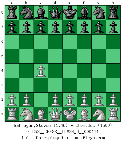 Last move : 1-0 2009 January 31 20:20:9 [Event "FICGS__CHESS__CLASS_D__000111"] [Site "FICGS"] [Date "2008.12.16"] [Round "1"] [White "Gaffagan,Steven"] [Black "Chen,Des"] [Result "1-0"] [WhiteElo "1746"] [BlackElo "1600"] 1.c4 1-0 This chess game has been lost on time (started : 2008.12.16 20:51:1) English Opening Player White won this chess game. Follow this game move after move (download)I'm not a materialistic person, in that, I don't suffer the lack or loss of money. The absence of worldly goods I don't look back on. For Chess is a way I can be as materialistic as I want without having to sell my soul. (Jamie Walter Adams) Wenn ich einen Club besuche, sind die Spieler stumm vor Staunen. (José Raúl Capablanca) Nos gusta pensar. (Gary Kasparov) Aux échecs, les retours au sommet sont rares : les dommages psychologiques consécutifs à une défaite sont trop sévères. (Daily Telegraph) When you don't know what to do, walk fast and look worried. (Anonymous)