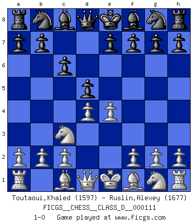 Last move : 1-0 2009 January 29 8:8:12 [Event "FICGS__CHESS__CLASS_D__000111"] [Site "FICGS"] [Date "2008.12.16"] [Round "1"] [White "Toutaoui,Khaled"] [Black "Ruslin,Alexey"] [Result "1-0"] [WhiteElo "1597"] [BlackElo "1677"] 1.e4 c6 2.d4 d5 3.Nc3 1-0 This chess game has been lost on time (started : 2008.12.16 20:51:1) Caro-Kann defense Player White won this chess game. Follow this game move after move (download)It is no time to be playing Chess when the house is on fire. (Italian Proverb) Die Partien sind immer verschieden, die Interviews immer die gleichen. (Garry Kasparov) Me siento como si fuera una pieza en una partida de Ajedrez, cuando mi oponente me indica: esa pieza no puede ser movida. (Soren Kierkegaard) Ce qui caractérise les parties de combat, c'est que si le défenseur a constamment de difficiles problèmes à résoudre, l'attaquant doit chercher sans relâche de nouvelles possibilités d'attaque. (Koblentz) The arrogant army will lose certainly the battle. (Chinese proverb)