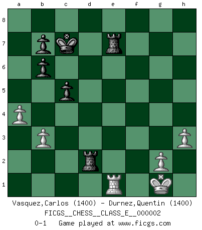 Last move : 0-1 2006 September 21 20:28:3 [Event "FICGS__CHESS__CLASS_E__000002"] [Site "FICGS"] [Date "2006.04.15"] [Round "1"] [White "Vasquez,Carlos"] [Black "Durnez,Quentin"] [Result "0-1"] [WhiteElo "1400"] [BlackElo "1400"] 1.e4 e5 2.Nf3 Nc6 3.d4 exd4 4.Nxd4 Nge7 5.Nf3 g6 6.Bc4 Bg7 7.Nc3 d6 8.h3 f5 9.Ng5 Ne5 10.Be6 Bf6 11.Bxc8 Nxc8 12.Nf3 Nb6 13.exf5 Qe7 14.O-O O-O-O 15.fxg6 hxg6 16.Be3 Nec4 17.Bxb6 axb6 18.Qc1 g5 19.Nd5 Qg7 20.Nxf6 Qxf6 21.b3 Ne5 22.Nxg5 Rdg8 23.f4 Nf7 24.Qe3 Qg6 25.Rf2 Nxg5 26.fxg5 Qxg5 27.Qxg5 Rxg5 28.Kf1 Kd7 29.Re1 Rh7 30.Rfe2 c5 31.c4 Kc6 32.a4 Rg3 33.Re3 Rg5 34.Re8 d5 35.R8e6+ Kc7 36.cxd5 Rxd5 37.R1e3 Rf7+ 38.Rf3 Rfd7 39.Rfe3 Rd1+ 40.Re1 R1d3 41.R6e3 Rf7+ 42.Kg1 Rd2 43.Re7+ Rxe7 0-1 Scotch game Kingside Castling by player White (move 14) Queenside Castling by player Black (move 14) Player Black won this chess game. Follow this game move after move (download)You know, comrade Pachman, I don't enjoy being a Minister, I would rather play Chess like you. (Che Guevara) Warum muß ich gegen diesen IDIOTEN verlieren? (Aaron Nimzowitsch) Yo no creo en la psicología. Yo creo en las buenas movidas. (Bobby Fischer) Que feriez-vous si vous étiez en train de jouer aux échecs et que la fin du monde arrive ? Je continuerais à jouer. (Saint Borromée) All the biggest technological inventions created by man - the airplane, the automobile, the computer - says little about his intelligence, but speaks volumes about his laziness. (Mark Kennedy)