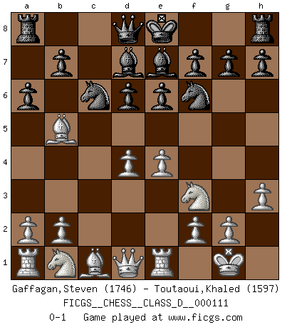 Last move : 0-1 2009 February 3 20:29:41 [Event "FICGS__CHESS__CLASS_D__000111"] [Site "FICGS"] [Date "2008.12.16"] [Round "1"] [White "Gaffagan,Steven"] [Black "Toutaoui,Khaled"] [Result "0-1"] [WhiteElo "1746"] [BlackElo "1597"] 1.e4 c5 2.Nf3 Nc6 3.Bb5 d6 4.O-O Bd7 5.Re1 Nf6 6.h3 e6 7.c3 Be7 8.d4 cxd4 9.cxd4 a6 0-1 This chess game has been lost on time (started : 2008.12.16 20:51:1) Sicilian : Nimzovich-Rossolimo attack (without ...d6) Kingside Castling by player White (move 4) Player Black won this chess game. Follow this game move after move (download)In order to improve your game, you must study the endgame before everything else, for whereas the endings can be studied and mastered by themselves, the middle game and the opening must be studied in relation to the endgame. (Jose Raul Capablanca) Wenn es im Universum noch irgendwo intelligente Lebewesen gibt, dann kennen sie Go. (Emanuel Lasker) Personalmente, yo prefiero mirar hacia el futuro en donde un programa de computadora gane el título mundial de Ajedrez. La humanidad necesita una lección de humildad. (Richard Dawkings) Il (Jacob Murray) ne joue pas pour le bon coup, mais pour le meilleur. (Eloi Relange) We need strong personalities and only one world champion to attract sponsors. (Anatoly Karpov)