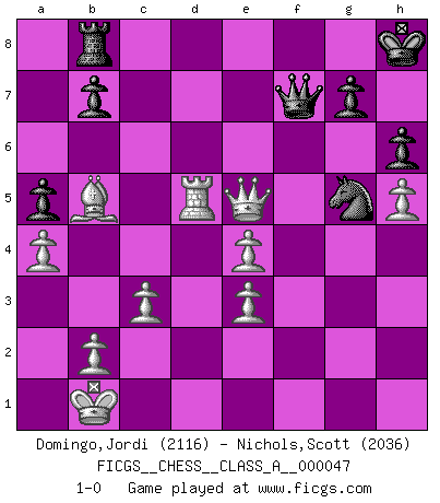 Last move : 1-0 2009 March 26 2:7:56 [Event "FICGS__CHESS__CLASS_A__000047"] [Site "FICGS"] [Date "2008.12.17"] [Round "1"] [White "Domingo,Jordi"] [Black "Nichols,Scott"] [Result "1-0"] [WhiteElo "2116"] [BlackElo "2036"] 1.e4 c5 2.Nf3 d6 3.d4 cxd4 4.Nxd4 Nf6 5.Nc3 a6 6.Be3 Nbd7 7.g4 Nb6 8.h3 e5 9.Nf3 Be7 10.g5 Nfd7 11.a4 a5 12.h4 Qc7 13.Bb5 O-O 14.h5 Nc5 15.Qe2 Bg4 16.Rh4 Bxf3 17.Qxf3 Ne6 18.Qg3 Rfc8 19.O-O-O Qd8 20.Rg4 Nc4 21.g6 Nxe3 22.gxf7+ Kxf7 23.fxe3 h6 24.Rg6 Ng5 25.Nd5 Kg8 26.Qg4 Rc5 27.Kb1 Kh8 28.Nxe7 Qxe7 29.Rgxd6 Rac8 30.Rd7 Qf8 31.c3 R5c7 32.R1d5 Rxd7 33.Rxd7 Rb8 34.Rd5 Qf6 35.Qf5 Qf7 36.Qxe5 1-0 Sicilian : Najdorf, Byrne (English) attack Kingside Castling by player Black (move 13) Queenside Castling by player White (move 19) Player White won this chess game. Follow this game move after move (download)Bobby is the finest Chess player this country ever produced. His memory for the moves, his brilliance in dreaming up combinations, and his fierce determination to win are uncanny. (John Collins) Die Auseinandersetzung mit Karpow war politisch geprägt. Er stand für das kommunistische System, wurde von dessen Repräsentanten gehätschelt. Ich war der Oppositionelle. Jeder Schachweltmeister spiegelt auch die gesellschaftlichen Verhältnisse wider. Kramnik steht für die Börsen-Generation des Neuen Markts, ideologiefrei, zahlenfixiert. (Garry Kasparov) Es el objetivo de la escuela moderna no tratar cada posición de acuerdo a una regla general, sino de acuerdo al principio inherente en la posición. (Richard Reti) Soyez une menace à chaque fois que vous vous asseyez pour jouer. (Ken Smith) Cactus - It is depressed cucumber. (Ilmars Cirulis)