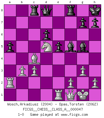 Last move : 1-0 2009 August 23 9:19:23 [Event "FICGS__CHESS__CLASS_A__000047"] [Site "FICGS"] [Date "2008.12.17"] [Round "1"] [White "Wosch,Arkadiusz"] [Black "Opas,Torsten"] [Result "1-0"] [WhiteElo "2004"] [BlackElo "2062"] 1.e4 c5 2.Nf3 d6 3.d4 cxd4 4.Nxd4 Nc6 5.Nc3 e5 6.Ndb5 a6 7.Na3 b5 8.Nd5 Nf6 9.Bg5 Be7 10.Bxf6 Bxf6 11.c3 O-O 12.Nc2 Bg5 13.a4 bxa4 14.Rxa4 a5 15.Bc4 Bd7 16.Nce3 Ne7 17.Ra2 Rb8 18.b3 Nxd5 19.Nxd5 Kh8 20.O-O f5 21.exf5 Bxf5 22.g3 Be6 23.Re1 Rc8 24.Qd3 Bf5 25.Qf1 1-0 This chess game has been lost on time (started : 2008.12.17 7:24:6) Sicilian Kingside Castling by player Black (move 11) Kingside Castling by player White (move 20) Player White won this chess game. Follow this game move after move (download)A Chess game is divided into three stages: the first, when you hope you have the advantage, the second when you believe you have an advantage, and the third... when you know you're going to lose ! (Savielly Tartakower) Mit Schach schule ich mein Gefühl für Geometrie, was für Tennis und Schach gleichermaßen wichtig ist. (Boris Becker) Vive, pierde y aprende al observar a tu oponente como ganar. (Amber Steenbock) L'attaque fait le spectacle, la défense gagne les matchs. (Dicton footballistique) Hold em is to stud what chess is to checkers. (Johnny Moss)