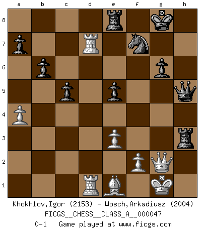 Last move : 0-1 2009 September 4 9:0:17 [Event "FICGS__CHESS__CLASS_A__000047"] [Site "FICGS"] [Date "2008.12.17"] [Round "1"] [White "Khokhlov,Igor"] [Black "Wosch,Arkadiusz"] [Result "0-1"] [WhiteElo "2153"] [BlackElo "2004"] 1.d4 Nf6 2.c4 e6 3.Nc3 Bb4 4.e3 O-O 5.Bd3 d5 6.Nf3 c5 7.O-O Nc6 8.a3 Bxc3 9.bxc3 dxc4 10.Bxc4 Qc7 11.Ba2 e5 12.h3 e4 13.Nh2 b6 14.Bb2 Na5 15.Qe2 Be6 16.Bxe6 fxe6 17.Ng4 Nxg4 18.Qxg4 Qc6 19.a4 Rf5 20.d5 Qxd5 21.c4 Qb7 22.Rac1 Raf8 23.Rc2 e5 24.Rd1 h5 25.Qh4 Qc6 26.Kh2 Kh7 27.Kg1 Re8 28.Bc3 Nxc4 29.Be1 Nd6 30.g4 Rf6 31.Qxh5+ Kg8 32.Rcd2 g6 33.Qh4 Nf7 34.g5 Rf5 35.Rd7 Rxg5+ 36.Kh2 Rh5 37.Qg4 Qf6 38.Qxe4 Rxh3+ 39.Kg1 Qg5+ 40.Qg2 Qh5 0-1 Nimzo-Indian : 4.e3 O-O, 5.Bd3 d5 Kingside Castling by player Black (move 4) Kingside Castling by player White (move 7) Player Black won this chess game. Follow this game move after move (download)For surely of all the drugs in the world, Chess must be the most permanently pleasurable. (Assiac) Fallen sollten polizeilich verboten werden. (Savielly Grigorievitsch Tartakower) Si pudieramos observar el interior de la cabeza de un jugador de Ajedrez, encontraríamos ahí un mundo lleno de sentimientos, imágenes, ideas, emoción y pasión. (Alfred Binet) Le thème de l'attaque double intervient d'une manière ou d'une autre dans l'immense majorité des combinaisons. (Youri Averbakh) An expert is a man who has made all the mistakes which can be made in a very narrow field. (Niels Bohr)