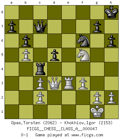 Last move : 0-1 2009 September 9 9:46:24 [Event "FICGS__CHESS__CLASS_A__000047"] [Site "FICGS"] [Date "2008.12.17"] [Round "1"] [White "Opas,Torsten"] [Black "Khokhlov,Igor"] [Result "0-1"] [WhiteElo "2062"] [BlackElo "2153"] 1.e4 e6 2.d4 d5 3.Nc3 Bb4 4.exd5 exd5 5.Bd3 Nc6 6.a3 Bxc3+ 7.bxc3 Nf6 8.Ne2 Na5 9.O-O O-O 10.Ng3 Bg4 11.f3 Be6 12.Bf4 Nc4 13.Qb1 b6 14.a4 Re8 15.Qc1 Kf8 16.Be5 h6 17.Qf4 Nxe5 18.dxe5 Nd7 19.Bb5 c6 20.Bxc6 Rc8 21.Bb5 Re7 22.Qd4 Kg8 23.Rae1 f5 24.exf6 Nxf6 25.Re3 Bd7 26.Rfe1 Rxe3 27.Rxe3 Bxb5 28.axb5 Rc4 29.Qd3 Qc7 30.Nf5 Kh8 0-1 French : Winawer (Nimzovich) variation Kingside Castling by player White (move 9) Kingside Castling by player Black (move 9) Player Black won this chess game. Follow this game move after move (download)Spassky will not be psyched out by Fischer. (Mike Goodall) Heutzutage gewinnt im Turnier nicht derjenige Spieler, der weitreichende Pläne entwirft, sondern einfach jener, der Zug um Zug kämpft. (David Bronstein) No todos los artistas son jugadores de Ajedrez, pero todos los jugadores de Ajedrez son artistas. (Marcel Duchamp) J'ai toujours senti une vague pitié pour l'homme qui ne connaît rien aux échecs, tout comme j'en aurais pour un homme ignorant de l'amour. Les Echecs, comme la musique ou comme l'amour, ont le pouvoir de rendre heureux. (Siegbert Tarrasch) A shortcut is the longest distance between two points. (Don Groves)