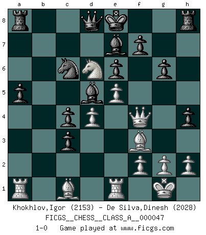 Last move : 1-0 2009 May 25 20:59:7 [Event "FICGS__CHESS__CLASS_A__000047"] [Site "FICGS"] [Date "2008.12.17"] [Round "1"] [White "Khokhlov,Igor"] [Black "De Silva,Dinesh"] [Result "1-0"] [WhiteElo "2153"] [BlackElo "2028"] 1.d4 d5 2.c4 c6 3.Nf3 Nf6 4.Nc3 dxc4 5.e4 b5 6.e5 Nd5 7.a4 e6 8.axb5 Nxc3 9.bxc3 cxb5 10.Ng5 Bb7 11.Qh5 g6 12.Qg4 Be7 13.Be2 Bd5 14.Bf3 h5 15.Qg3 a5 16.O-O Nc6 17.Re1 b4 18.Ne4 h4 19.Qf4 bxc3 20.Nd6+ 1-0 QGD Slav : Tolush-Geller gambit Kingside Castling by player White (move 16) Player White won this chess game. Follow this game move after move (download)Not all artists are Chess players, but all Chess players are artists. (Marcel Duchamp) Im Leben werden Partien nie so unstrittig gewonnen wie im Spiel (Emanuel Lasker) Cuando no sepas que mover, espera por una idea que se le venga a la la cabeza de tu oponente. Tenlo por seguro de que esa idea estará incorrecta. (Siegbert Tarrasch) La menace est plus forte que l'exécution. (Aaron Nimzovitch) If I had no sense of humor, I would long ago have committed suicide. (Mahatma Gandhi)