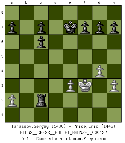 Last move : 0-1 2009 June 20 16:4:39 [Event "FICGS__CHESS__BULLET_BRONZE__000127"] [Site "FICGS"] [Date "2009.06.20"] [Round "1"] [White "Tarassov,Sergey"] [Black "Price,Eric"] [Result "0-1"] [WhiteElo "1400"] [BlackElo "1446"] 1.e4 e5 2.h3 Nf6 3.d3 Nc6 4.Bg5 Be7 5.Bxf6 Bxf6 6.g4 d5 7.exd5 Qxd5 8.Nf3 e4 9.dxe4 Qxe4+ 10.Qe2 Qxe2+ 11.Bxe2 Bxb2 12.Nbd2 Bxa1 13.O-O Bc3 14.Bb5 Bd7 15.Bxc6 Bxc6 16.Re1+ Kf8 17.Re3 Bxd2 18.Nxd2 Re8 19.Nc4 Rxe3 20.fxe3 Ke7 21.Na5 Rd8 22.Nxc6+ bxc6 23.Kf2 Rd2+ 24.Kf3 Rxc2 0-1 King's pawn game Kingside Castling by player White (move 13) Player Black won this chess game. Follow this game move after move (download)Everything is in a state of flux, and this includes the world of Chess. (Mikhail Botvinnik) Ich würde die 30 stärksten Spieler der USA im Simultanspiel besiegen. (José Raúl Capablanca) Combinaciones deslumbrantes son para la mayoría, mover madera es para los pocos. (Georg Kieninger) A ce moment-là, je menaçais de comprendre la position ! (Clément L'Heureux) Be who you are, and say what you feel because those who mind don't matter, and those who matter don't mind. (Dr Seuss)