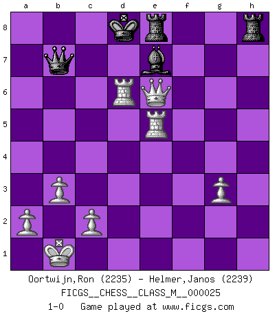 Last move : 1-0 2009 March 5 4:18:50 [Event "FICGS__CHESS__CLASS_M__000025"] [Site "FICGS"] [Date "2008.12.18"] [Round "1"] [White "Oortwijn,Ron"] [Black "Helmer,Janos"] [Result "1-0"] [WhiteElo "2235"] [BlackElo "2239"] 1.e4 c5 2.Nf3 Nc6 3.d4 cxd4 4.Nxd4 Nf6 5.Nc3 d6 6.Bg5 e6 7.Qd2 a6 8.O-O-O Bd7 9.f4 h6 10.Bh4 b5 11.Bxf6 gxf6 12.Nxc6 Bxc6 13.Bd3 b4 14.Ne2 Qb6 15.f5 h5 16.fxe6 fxe6 17.Kb1 Bh6 18.Qe1 Ke7 19.Rf1 Rag8 20.g3 h4 21.Bc4 hxg3 22.hxg3 Qc5 23.Bxe6 Kxe6 24.Nd4+ Kd7 25.Nxc6 Kxc6 26.Rf5 Qc4 27.Rfd5 Kc7 28.R1d4 Qc6 29.b3 Kd7 30.Qxb4 Bf8 31.Rc5 a5 32.Qxa5 Qb7 33.Qa4+ Ke6 34.Qc4+ Kd7 35.Qf7+ Be7 36.e5 fxe5 37.Rxe5 Re8 38.Qe6+ Kd8 39.Rxd6+ 1-0 Sicilian defense Queenside Castling by player White (move 8) Player White won this chess game. Follow this game move after move (download)Help your pieces so they can help you. (Paul Morphy) Schach ist das Spiel, das die Verrückten gesund hält. (Albert Einstein) Mi estilo es algo parecido entre un poco de Tal y Petrosian. (Reshevsky) Le plus grand jeu de l'esprit jamais inventé, plus vous l'apprenez, plus vous y prenez du plaisir. (Garry Kasparov) The Movers & Shakers of this world are those who play chess in the mornings and go to the disco in the evenings. (Dinesh De Silva)