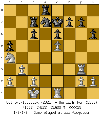 Last move : 1/2-1/2 2009 January 27 19:52:33 [Event "FICGS__CHESS__CLASS_M__000025"] [Site "FICGS"] [Date "2008.12.18"] [Round "1"] [White "Ostrowski,Leszek"] [Black "Oortwijn,Ron"] [Result "1/2-1/2"] [WhiteElo "2321"] [BlackElo "2235"] 1.e4 c5 2.Nf3 d6 3.d4 cxd4 4.Nxd4 Nf6 5.Nc3 a6 6.Bg5 e6 7.f4 Qb6 8.Qd2 Nc6 9.O-O-O Nxd4 10.Qxd4 Qxd4 11.Rxd4 Be7 12.Be2 Bd7 13.Bf3 Bc6 14.Bh4 h6 15.e5 dxe5 16.fxe5 Nd7 17.Bxc6 bxc6 18.Bxe7 Kxe7 19.Re1 a5 20.Na4 Rab8 21.b3 Rhd8 22.Rd3 Rbc8 23.Rc3 Rc7 24.Rg3 1/2-1/2 Sicilian : Najdorf, 7...Qb6 Queenside Castling by player White (move 9) This chess game ended in a draw. Follow this game move after move (download)I'm not afraid of Spassky. The world knows I'm the best. You don't need a match to prove it. (Bobby Fischer) Ohne Fehler kann es keine Brillanz geben. (Emanuel Lasker) El muchacho (en ese entonces un niño de 12 años llamado Anatoly Karpov) no tiene ni idea de lo que es el Ajedrez y no hay futuro en absoluto para el en esta profesión. (Mikhail Botvinnik) Les réformistes prétendent que les progrès de la théorie conduiront à la disparition des échecs, et qu'il faut, pour leur rendre vie, en remanier les règles. En réalité, qu'exprime cette affirmation? Le mépris de l'intuition, de l'imagination et de tous les autres éléments qui font des échecs un art. (Alexander Alekhine) I feel so... helpless. (C-3PO in Star Wars ep.3)