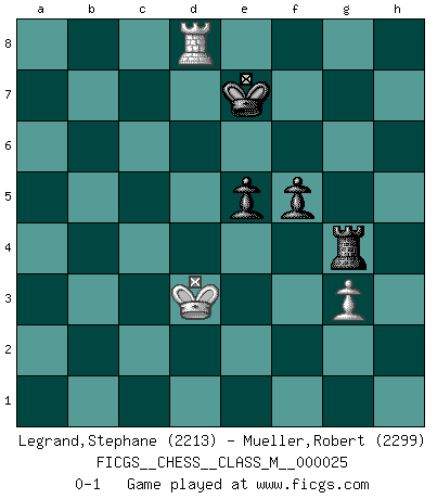 Last move : 0-1 2010 March 3 18:48:45 [Event "FICGS__CHESS__CLASS_M__000025"] [Site "FICGS"] [Date "2008.12.18"] [Round "1"] [White "Legrand,Stephane"] [Black "Mueller,Robert"] [Result "0-1"] [WhiteElo "2213"] [BlackElo "2299"] 1.e4 c5 2.Nf3 d6 3.d4 cxd4 4.Nxd4 Nf6 5.Nc3 a6 6.Bg5 e6 7.Be2 Be7 8.O-O Nbd7 9.Qd3 h6 10.Bc1 Ne5 11.Qg3 g5 12.a3 Bd7 13.Qe3 Qc7 14.Rd1 g4 15.b4 h5 16.Bb2 h4 17.b5 Rg8 18.a4 g3 19.fxg3 Nfg4 20.Bxg4 Rxg4 21.Nce2 Bg5 22.Qf2 Rxe4 23.Bc1 Bd8 24.Bf4 axb5 25.gxh4 Qc4 26.c3 bxa4 27.h3 Bc6 28.Bg5 Bxg5 29.hxg5 Qc5 30.Ng3 Rh4 31.Ngf5 Rh8 32.Nxc6 Qxf2+ 33.Kxf2 bxc6 34.Nxd6+ Ke7 35.Ne4 a3 36.Rdb1 Rh4 37.Nf6 Rc4 38.Rb3 a2 39.Ke2 Kf8 40.Rb2 Rca4 41.h4 Kg7 42.h5 Ng4 43.Nxg4 Rxg4 44.Ke3 Ra5 45.R1xa2 Re5+ 46.Kf3 Rexg5 47.Rf2 Rh4 48.Ke3 Re5+ 49.Kd3 Rd5+ 50.Ke3 R4xh5 51.Rf4 Rhe5+ 52.Kf2 Rf5 53.Rxf5 Rxf5+ 54.Ke3 Rg5 55.Ra6 Rg3+ 56.Kd4 c5+ 57.Kxc5 Rxc3+ 58.Kd4 Rc2 59.g3 Re2 60.Ra7 Kg6 61.Ra8 f5 62.Rg8+ Kh5 63.Kd3 Re4 64.Kd2 e5 65.Kd3 Rg4 66.Rh8+ Kg5 67.Rg8+ Kf6 68.Rf8+ Ke6 69.Re8+ Kd6 70.Rd8+ Ke7 0-1 Sicilian : Najdorf, 6...e6 Kingside Castling by player White (move 8) 10 pieces endgame at move 53 : White KRRPP , Black KRPPP WHITE : King + 2 Rooks 2 Pawns BLACK : King + 1 Rook 3 Pawns 9 pieces endgame at move 53 : White KRPP , Black KRPPP WHITE : King + 1 Rook 2 Pawns BLACK : King + 1 Rook 3 Pawns 8 pieces endgame at move 57 : White KRPP , Black KRPP WHITE : King + 1 Rook 2 Pawns BLACK : King + 1 Rook 2 Pawns 7 pieces endgame at move 57 : White KRP , Black KRPP WHITE : King + 1 Rook 1 Pawn BLACK : King + 1 Rook 2 Pawns Player Black won this chess game. Follow this game move after move (download)Everything is in a state of flux, and this includes the world of Chess. (Mikhail Botvinnik) Es ist peinlich, dass ich nie Weltmeister wurde. Es wäre leicht, Leonid Breschnjew als Ursache vorzuschieben, dessen Apparat den Vorzeigekommunisten Anatoli Karpow in allem unterstützte. Aber Garri Kasparow zum Beispiel, der ebenfalls von den Sowjets unerwünscht war, hat trotz der Widerstände den WM-Titel erobert. (Viktor Kortschnoi) Ciertamente el estado mental actual de Bobby Fischer es una tragedia. Uno de los mas grandes jugadores de Ajedrez del mundo -el orgullo y pena del Ajedrez Americano. (Frank Brady) La tactique est l'élément le plus important du milieu de jeu. (Siegbert Tarrasch) The intuitive mind is a sacred gift; the rational mind is a faithful servant. We have created a society that honors the servant but has forgotten the gift. (Albert Einstein)
