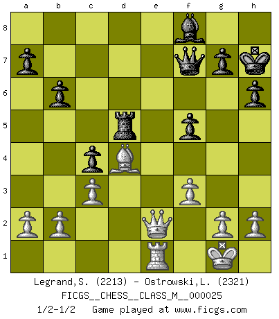 Last move : 1/2-1/2 2009 April 10 13:38:5 [Event "FICGS__CHESS__CLASS_M__000025"] [Site "FICGS"] [Date "2008.12.18"] [Round "1"] [White "Legrand,Stephane"] [Black "Ostrowski,Leszek"] [Result "1/2-1/2"] [WhiteElo "2213"] [BlackElo "2321"] 1.e4 e5 2.Nf3 Nf6 3.Nxe5 d6 4.Nf3 Nxe4 5.d4 d5 6.Bd3 f5 7.O-O Be6 8.Re1 Be7 9.Ne5 Nd7 10.Nxd7 Qxd7 11.f3 Nd6 12.Qe2 Kf7 13.Bf4 Rhe8 14.Nc3 c6 15.Qf2 Kg8 16.Rad1 b6 17.Ne2 Nc4 18.Bxc4 dxc4 19.Be5 Rad8 20.c3 Bd6 21.Ng3 Bf8 22.Nh5 Bf7 23.Qh4 h6 24.Qh3 Bxh5 25.Qxh5 Qf7 26.Qh4 c5 27.Qf2 Kh7 28.Qc2 cxd4 29.Bxd4 Rxe1+ 30.Rxe1 Rd5 31.Qe2 1/2-1/2 Petrov : Classical attack Kingside Castling by player White (move 7) This chess game ended in a draw. Follow this game move after move (download)Some part of a mistake is always correct. (Savielly Tartakover) Schach sollte überall auf der Welt Schulfach werden. Es fördert die geistige Auseinandersetzung. Es lehrt die Demut in der Niederlage. (Garry Kasparov) Yo jugué Ajedrez con el y a veces le pude haber ganado solo que siempre devuelve su última jugada y juega la partida de manera diferente. (Mark Twain) C'est la seule position que je connaisse où les deux camps sont mals. Propos prêtés à V. Anand. Think like a man of action, act like a man of thought. (Henri Louis Bergson)