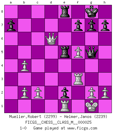 Last move : 1-0 2009 June 4 14:35:16 [Event "FICGS__CHESS__CLASS_M__000025"] [Site "FICGS"] [Date "2008.12.18"] [Round "1"] [White "Mueller,Robert"] [Black "Helmer,Janos"] [Result "1-0"] [WhiteElo "2299"] [BlackElo "2239"] 1.e4 c5 2.Nf3 Nc6 3.d4 cxd4 4.Nxd4 Nf6 5.Nc3 d6 6.Bc4 e6 7.O-O Be7 8.Bb3 O-O 9.Be3 Bd7 10.f4 Nxd4 11.Bxd4 Bc6 12.Qe2 b5 13.Nxb5 Bxb5 14.Qxb5 Nxe4 15.f5 e5 16.Be3 Bg5 17.Bxg5 Qxg5 18.Rae1 Nd2 19.Rf2 e4 20.Kh1 Nxb3 21.axb3 Rae8 22.Qd5 e3 23.Rf3 e2 24.Kg1 Re5 25.Qxd6 Rfe8 26.b4 1-0 This chess game has been lost on time (started : 2008.12.18 20:18:47) Sicilian defense Kingside Castling by player White (move 7) Kingside Castling by player Black (move 8) Player White won this chess game. Follow this game move after move (download)Examine moves that smite! A good eye for smites is far more important than a knowledge of strategical principles. (Purdy) Privat ist Kortschnoi kein schlechter Mensch, sehr sympathisch. Aber während des Spiels ist er grausam. Er will dich töten. (Miguel Najdorf) ¡Examina movidas que hagan daño! Un buen ojo for movidas desvastantes es mucho mas importante que el conocimiento de principios estratégicos. (Purdy) J'ai toujours senti une vague pitié pour l'homme qui ne connaît rien aux échecs, tout comme j'en aurais pour un homme ignorant de l'amour. Les Echecs, comme la musique ou comme l'amour, ont le pouvoir de rendre heureux. (Siegbert Tarrasch) Chess, like love, like music, has the power to make people happy. (Siegbert Tarrasch)