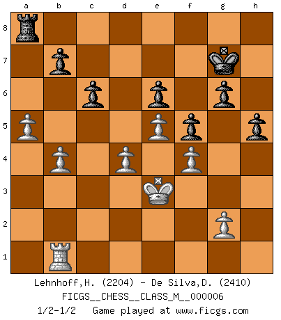 Last move : 1/2-1/2 2007 June 7 2:39:52 [Event "FICGS__CHESS__CLASS_M__000006"] [Site "FICGS"] [Date "2006.08.22"] [Round "1"] [White "Lehnhoff,Heinz-Georg"] [Black "De Silva,Dinesh"] [Result "1/2-1/2"] [WhiteElo "2204"] [BlackElo "2410"] 1.d4 d5 2.c4 c6 3.Nf3 Nf6 4.Nc3 dxc4 5.a4 Bf5 6.Ne5 Nbd7 7.Nxc4 Nb6 8.Ne5 a5 9.Bg5 h6 10.Bh4 e6 11.e4 Bh7 12.f3 Be7 13.Bf2 Nfd7 14.Nd3 Qc7 15.Be2 Bd6 16.Rc1 Bxh2 17.e5 Bxd3 18.Qxd3 Bf4 19.Nb5 Qb8 20.Nd6+ Kf8 21.Be3 Nd5 22.Bxf4 Nxf4 23.Qd2 Nxe2 24.Kxe2 Nb6 25.Rc5 Nc8 26.Nxc8 Qxc8 27.Rxa5 Rxa5 28.Qxa5 g6 29.Qb4+ Kg7 30.Qe7 Qd8 31.Qxd8 Rxd8 32.Ke3 h5 33.b4 f6 34.f4 f5 35.Rb1 Ra8 36.a5 1/2-1/2 QGD Slav : Krause attack This chess game ended in a draw. Follow this game move after move (download)Modern Chess is too much concerned with things like Pawn structure. Forget it, Checkmate ends the game. (Nigel Short) Woher wissen wir, daß der Neanderthaler Blindschach gespielt hat? -- Bei Ausgrabungen wurden keine Schachbretter und Figuren gefunden. (Anonymous) El Ajedrez era la lengua materna de Capablanca. (Reti) Ce qui caractérise les parties de combat, c'est que si le défenseur a constamment de difficiles problèmes à résoudre, l'attaquant doit chercher sans relâche de nouvelles possibilités d'attaque. (Koblentz) Luck never gives; it only lends. (Swedish proverb)