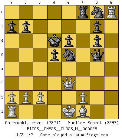 Last move : 1/2-1/2 2009 January 12 5:14:13 [Event "FICGS__CHESS__CLASS_M__000025"] [Site "FICGS"] [Date "2008.12.18"] [Round "1"] [White "Ostrowski,Leszek"] [Black "Mueller,Robert"] [Result "1/2-1/2"] [WhiteElo "2321"] [BlackElo "2299"] 1.e4 c6 2.d4 d5 3.e5 Bf5 4.Nc3 e6 5.g4 Bg6 6.Nge2 c5 7.h4 h5 8.Nf4 cxd4 9.Nxg6 fxg6 10.Qxd4 Nc6 11.Qd3 Nxe5 12.Qe2 Bd6 13.gxh5 Rxh5 14.Bg5 Rxg5 15.hxg5 Qxg5 16.Nb5 Kd7 17.Nxd6 Kxd6 18.Rh8 Rf8 19.Qe3 1/2-1/2 Caro-Kann : Advance variation This chess game ended in a draw. Follow this game move after move (download)Of Chess it has been said that life is not long enough for it, but that is the fault of life, not Chess. (William Ewart Napier) Offener Brief an US-Präsident Bush anlässlich der Verhaftung Bobby Fishers: Verhaften Sie mich. Stecken Sie mich in dieselbe Zelle wie Bobby Fisher und geben Sie uns ein Schachspiel mit. (Boris Vassilievich Spassky) Existen dos clases de sacrificios: los correctos y los míos. (Mikhail Tal) Toutes choses étant égales, c'est la conviction qui gagne. Alliée à une volonté de vaincre, elle sert de détonateur, suscite des idées, disperse les doutes et aide à penser clairement. (Robert Fischer) The Internet is so big, so powerful and pointless that for some people it is a complete substitute for life. (Andrew Brown)