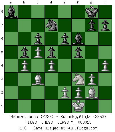 Last move : 1-0 2009 August 30 21:38:53 [Event "FICGS__CHESS__CLASS_M__000025"] [Site "FICGS"] [Date "2008.12.18"] [Round "1"] [White "Helmer,Janos"] [Black "Kubasky,Alojz"] [Result "1-0"] [WhiteElo "2239"] [BlackElo "2253"] 1.c4 e6 2.d4 Nf6 3.Nf3 b6 4.g3 Ba6 5.b3 Bb4+ 6.Bd2 Be7 7.Bg2 c6 8.Bc3 d5 9.Ne5 Nfd7 10.Nxd7 Nxd7 11.Nd2 O-O 12.O-O Rc8 13.Re1 f5 14.a4 Nf6 15.a5 Bb7 16.Qc2 Qc7 17.Qb2 Rb8 18.axb6 axb6 19.Ra7 Ra8 20.Rea1 Rxa7 21.Rxa7 Ra8 22.Rxa8+ Bxa8 23.b4 Bb7 24.Qa2 Qc8 25.Qa7 Nd7 26.c5 b5 27.Nf3 Bf6 28.h4 Qa8 29.Qxa8+ Bxa8 30.Kf1 1-0 This chess game has been lost on time (started : 2008.12.18 20:18:47) English Opening Kingside Castling by player Black (move 11) Kingside Castling by player White (move 12) Player White won this chess game. Follow this game move after move (download)Only sissies Castle. (Rob Sillars) Im Fernschach kannst du während dem Spiel rauchen. (John Christen Knudsen) La partida mas dura de ganar es una partida ganada. (Emanuel Lasker) Il (Jacob Murray) ne joue pas pour le bon coup, mais pour le meilleur. (Eloi Relange) Never was anything great achieved without danger. (Niccolo Machiavelli)