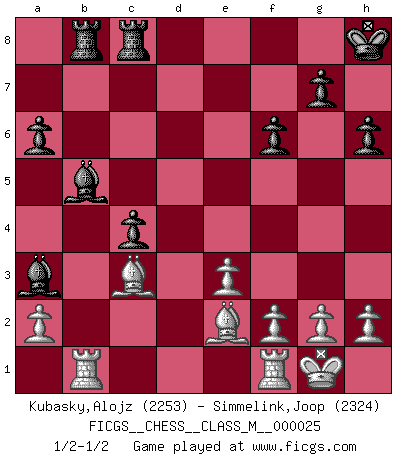 Last move : 1/2-1/2 2009 March 9 14:47:34 [Event "FICGS__CHESS__CLASS_M__000025"] [Site "FICGS"] [Date "2008.12.18"] [Round "1"] [White "Kubasky,Alojz"] [Black "Simmelink,Joop"] [Result "1/2-1/2"] [WhiteElo "2253"] [BlackElo "2324"] 1.c4 e6 2.Nc3 d5 3.d4 c6 4.e3 Nf6 5.Nf3 Nbd7 6.Qc2 Bd6 7.Bd3 O-O 8.O-O dxc4 9.Bxc4 a6 10.Rd1 b5 11.Be2 Qc7 12.Ne4 Nxe4 13.Qxe4 c5 14.Qh4 Bb7 15.b3 c4 16.bxc4 bxc4 17.Bd2 Ba3 18.Bc3 Rab8 19.Rab1 Bc6 20.Nd2 Ba4 21.Rf1 Bb5 22.d5 exd5 23.Qg5 f6 24.Qxd5+ Kh8 25.Ne4 Nb6 26.Qf5 Qc8 27.Qxc8 Rfxc8 28.Bd4 Nd5 29.Nc3 Nxc3 30.Bxc3 h6 1/2-1/2 English Opening Kingside Castling by player Black (move 7) Kingside Castling by player White (move 8) This chess game ended in a draw. Follow this game move after move (download)All I want to do, ever, is just play Chess. (Bobby Fischer) Um sich vor der Gefahr einer Erkältung zu schützen, sorge der wanderlustige König beizeiten für ein brauchbares Versteck. (Aaron Nimzowitsch) Solo el jugador con la iniciativa tiene el derecho a atacar. (Wilhelm Steinitz) J'ai vu le vaincu d'Echecs jouer des années durant dans l'espoir de la fête de la victoire. Car tu es plus riche de ce qu'elle existe si même elle n'est point pour toi. Ainsi de la perle du fond des mers. (Antoine de Saint-Exupéry) The absolute truth is the thing that makes people laugh. (Carl Reiner)