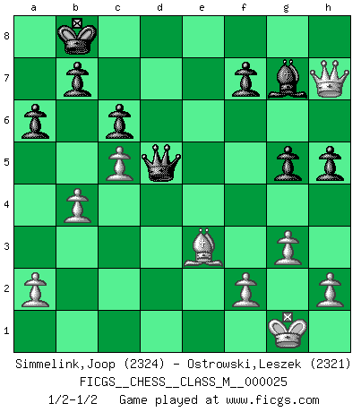 Last move : 1/2-1/2 2008 December 25 10:45:48 [Event "FICGS__CHESS__CLASS_M__000025"] [Site "FICGS"] [Date "2008.12.18"] [Round "1"] [White "Simmelink,Joop"] [Black "Ostrowski,Leszek"] [Result "1/2-1/2"] [WhiteElo "2324"] [BlackElo "2321"] 1.e4 e5 2.Nf3 Nf6 3.d4 Nxe4 4.Bd3 d5 5.Nxe5 Nd7 6.Nxd7 Bxd7 7.O-O Qh4 8.c4 O-O-O 9.c5 g5 10.Nc3 Bg7 11.g3 Qh3 12.Nxe4 dxe4 13.Bxe4 Bb5 14.Bg2 Qf5 15.Be3 Bxf1 16.Bxf1 c6 17.Qa4 Kb8 18.Rd1 Rd7 19.b4 a6 20.Bg2 Rhd8 21.d5 Rxd5 22.Bxd5 Rxd5 23.Rxd5 Qxd5 24.Qc2 h5 25.Qh7 Qd1+ 26.Kg2 Qd5+ 27.Kg1 1/2-1/2 Petrov : Modern attack, Symmetrical variation Kingside Castling by player White (move 7) Queenside Castling by player Black (move 8) This chess game ended in a draw. Follow this game move after move (download)A strong memory, concentration, imagination, and a strong will is required to become a great Chess player. (Bobby Fischer) Früher wurde jeder komplizierte Zug, jedes interessante Opfer mit großem Beifall und Enthusiasmus aufgenommen. Heute schaltet man einfach seinen Fritz an, und man kann sehen, was los ist, ob der Zug geht oder nicht. (Vladimir Kramnik) Uno por uno, yo los acribillé, mi superioridad muy pronto se volvio aparente. (Jose Capablanca) Plusieurs personnes se sont demandées comment Tal faisait pour gagner... En fait, c'est très simple ! Il met ses pièces au centre de l'échiquier et les sacrifie quelque part ! (David Bronstein) The problem with troubleshooting is that trouble shoots back. (Anonymous)
