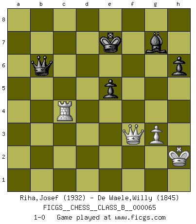 Last move : 1-0 2009 January 14 22:41:17 [Event "FICGS__CHESS__CLASS_B__000065"] [Site "FICGS"] [Date "2008.12.20"] [Round "1"] [White "Riha,Josef"] [Black "De Waele,Willy"] [Result "1-0"] [WhiteElo "1932"] [BlackElo "1845"] 1.e4 c5 2.c3 Nf6 3.e5 Nd5 4.d4 cxd4 5.Nf3 Nc6 6.Bc4 Nb6 7.Bb3 d5 8.exd6 Qxd6 9.O-O Be6 10.Na3 dxc3 11.Qe2 Bxb3 12.Nb5 Qb8 13.axb3 g6 14.Rd1 c2 15.Qxc2 Bg7 16.Be3 O-O 17.Nxa7 Rxa7 18.Bxb6 Rxa1 19.Rxa1 Rc8 20.Rc1 Qd6 21.Bc5 Qe6 22.Be3 Rd8 23.h3 Qd5 24.Bc5 e6 25.b4 h6 26.b5 Ne5 27.Nxe5 Bxe5 28.b4 g5 29.Qe2 Kg7 30.Kf1 Bf6 31.b6 Be5 32.Re1 Bc3 33.Rc1 Bf6 34.Be3 Qd6 35.Qg4 Bb2 36.Rc5 Qd3+ 37.Kg1 Rd5 38.g3 Rf5 39.Kh2 Bf6 40.Qc4 Qb1 41.Rc7 Qe1 42.Kg2 Rd5 43.Qf1 Qxb4 44.Qe2 Rf5 45.Qg4 Qb3 46.Qe4 Re5 47.Qxb7 Rxe3 48.Rxf7+ Kg6 49.Rf8 Rxg3+ 50.fxg3 Qc2+ 51.Kh1 Qb1+ 52.Kh2 Qb2+ 53.Qg2 Qxb6 54.Rc8 Be5 55.Qe4+ Kf7 56.Rc2 Bg7 57.Rd2 Kf6 58.h4 gxh4 59.Qxh4+ Kg6 60.Qg4+ Kf6 61.Rd4 e5 62.Qf3+ Ke7 63.Rc4 1-0 Sicilian : Alapin's variation (2.c3) Kingside Castling by player White (move 9) Kingside Castling by player Black (move 16) 10 pieces endgame at move 58 : White KQRP , Black KQBPPP WHITE : King + 1 Queen 1 Rook 1 Pawn BLACK : King + 1 Queen 1 Bishop 3 Pawns 9 pieces endgame at move 59 : White KQRP , Black KQBPP WHITE : King + 1 Queen 1 Rook 1 Pawn BLACK : King + 1 Queen 1 Bishop 2 Pawns Player White won this chess game. Follow this game move after move (download)Chess is played with the mind and not with the hands ! (Renaud and Kahn) Das Blackmar-Diemer-Gambit verändert den ganzen Menschen! (Emil Joseph Diemer) Yo considero que Fischer es uno de los expertos mas grandes de aperturas de siempre. (Keith Hayward) Les écrivains ont utilisé les échecs pour analyser les côtés extrêmes de la nature humaine. Dans ce cadre, les échecs offrent un champ d'expérimentation idéal. Mais on pourrait faire la même chose avec la peinture. Et là, en vous référant à Van Gogh, vous ne tirerez pas de conclusion définitive sur les peintres. (Gary Kasparov) A shortcut is the longest distance between two points. (Don Groves)