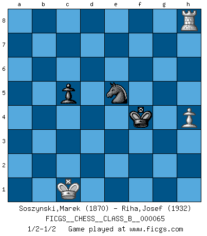Last move : 1/2-1/2 2008 December 25 8:51:24 [Event "FICGS__CHESS__CLASS_B__000065"] [Site "FICGS"] [Date "2008.12.20"] [Round "1"] [White "Soszynski,Marek"] [Black "Riha,Josef"] [Result "1/2-1/2"] [WhiteElo "1870"] [BlackElo "1932"] 1.e4 e5 2.d4 Nc6 3.dxe5 Nxe5 4.f4 Ng6 5.Qd4 N8e7 6.Be3 Nc6 7.Qd2 Bb4 8.c3 Ba5 9.h4 Nge7 10.Bc4 d6 11.Nf3 O-O 12.Na3 Bb6 13.O-O-O Na5 14.Bd3 f5 15.exf5 Bxf5 16.Bxf5 Rxf5 17.g4 Rd5 18.Qe2 Qd7 19.Bxb6 axb6 20.Ng5 h6 21.Qe6+ Qxe6 22.Nxe6 Rc8 23.Rxd5 Nxd5 24.Nb5 Nc4 25.b3 Nce3 26.Rg1 c5 27.c4 Nf6 28.g5 Nfg4 29.gxh6 gxh6 30.f5 Ra8 31.Nxd6 Rxa2 32.f6 Rf2 33.f7+ Rxf7 34.Nxf7 Kxf7 35.Nf4 Ne5 36.Re1 N3g4 37.Rd1 Ke7 38.Nd5+ Ke6 39.Nxb6 Nf6 40.Nd5 Nxd5 41.Rxd5 b5 42.Rd8 bxc4 43.bxc4 Kf5 44.Rd5 Kf4 45.Rd6 h5 46.Rd5 Nxc4 47.Rxh5 Ne5 48.Rh8 1/2-1/2 King's pawn game Kingside Castling by player Black (move 11) Queenside Castling by player White (move 13) 10 pieces endgame at move 41 : White KRPPP , Black KNPPP WHITE : King + 1 Rook 3 Pawns BLACK : King + 1 Knight 3 Pawns 9 pieces endgame at move 42 : White KRPP , Black KNPPP WHITE : King + 1 Rook 2 Pawns BLACK : King + 1 Knight 3 Pawns 8 pieces endgame at move 43 : White KRPP , Black KNPP WHITE : King + 1 Rook 2 Pawns BLACK : King + 1 Knight 2 Pawns 7 pieces endgame at move 46 : White KRP , Black KNPP WHITE : King + 1 Rook 1 Pawn BLACK : King + 1 Knight 2 Pawns 6 pieces endgame at move 47 : White KRP , Black KNP WHITE : King + 1 Rook 1 Pawn BLACK : King + 1 Knight 1 Pawn This chess game ended in a draw. Follow this game move after move (download)Chess is a forcing house where the fruits of character can ripen more fully than in life. (Edward Morgan Foster) Ich könnte leicht behaupten: Ja,ja, Leonid Breschnew wollte nicht, daß ich Weltmeister werde. In der Tat war die Sache komplizierter. (Viktor Kortschnoi) Bobby solo arroja las piezas y solas caen en las casillas correctas. (Miguel Najdorf ) Avant la finale, les dieux ont créé le milieu de partie. (Tarrasch) Beep ! (R2D2 in Star Wars ep.3)