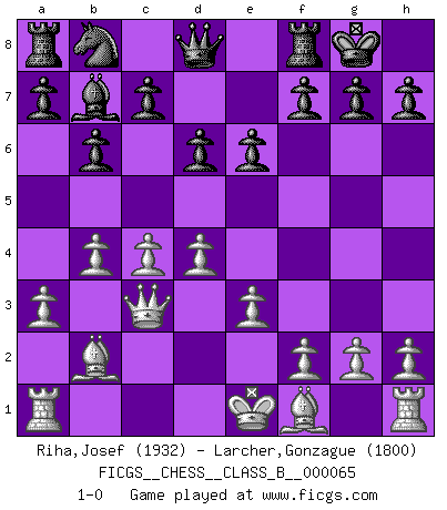 Last move : 1-0 2009 March 12 22:37:28 [Event "FICGS__CHESS__CLASS_B__000065"] [Site "FICGS"] [Date "2008.12.20"] [Round "1"] [White "Riha,Josef"] [Black "Larcher,Gonzague"] [Result "1-0"] [WhiteElo "1932"] [BlackElo "1800"] 1.c4 e6 2.Nc3 Nf6 3.d4 Bb4 4.e3 b6 5.Nge2 Ne4 6.Qc2 Bb7 7.a3 Bxc3+ 8.Nxc3 Nxc3 9.Qxc3 O-O 10.b4 d6 11.Bb2 1-0 This chess game has been lost on time (started : 2008.12.20 0:39:16) English Opening Kingside Castling by player Black (move 9) Player White won this chess game. Follow this game move after move (download)What is the object of playing a gambit opening?... To acquire a reputation of being a dashing player at the cost of losing a game. (Siegbert Tarrasch) Glücklicherweise sind Großmeister Ruben Fines reine Schachbücher weniger phallozentrisch [als seine Schachpsychologie] und deswegen auch weniger lächerlich. (Nigel Short) El Ajedrez, como cualquier actividad creativa, solo puede existir a través del esfuerzo combinado de aquellos que tienen talento creativo y de aquellos que poseen la habilidad de organizar su trabajo creativo. (Mikhail Botvinnik) Le profane ne songe pas à la somme de jouissance dont il se prive, qui méconnaît ce jeu aux ressources aussi variées que passionnantes. (Jean-Marie Jeanton-Lamarche) Man is reluctant to give credit for intelligence to anyone, except his enemies. (Albert Einstein)