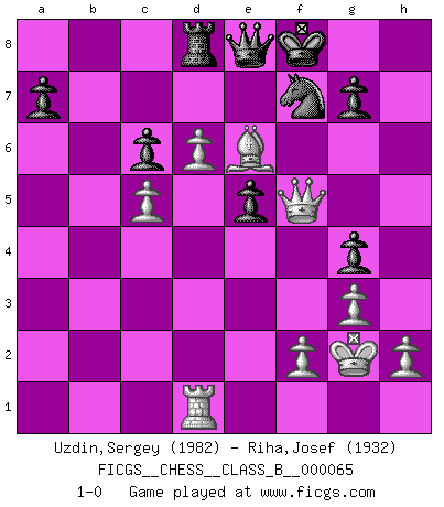 Last move : 1-0 2008 December 26 18:42:38 [Event "FICGS__CHESS__CLASS_B__000065"] [Site "FICGS"] [Date "2008.12.20"] [Round "1"] [White "Uzdin,Sergey"] [Black "Riha,Josef"] [Result "1-0"] [WhiteElo "1982"] [BlackElo "1932"] 1.e4 Nf6 2.e5 Nd5 3.d4 d6 4.Nf3 dxe5 5.Nxe5 c6 6.Be2 Bf5 7.O-O Nd7 8.Nf3 e6 9.c4 N5f6 10.Nc3 Qc7 11.Nh4 Bg6 12.Be3 Ne4 13.Nxg6 hxg6 14.g3 Nxc3 15.bxc3 Be7 16.Rb1 O-O 17.Bf3 Rac8 18.Re1 b6 19.a4 Bf6 20.Qe2 e5 21.a5 bxa5 22.c5 Rfe8 23.Qa6 Nb8 24.Qc4 Rcd8 25.Re2 Nd7 26.d5 e4 27.d6 Qc8 28.Bxe4 g5 29.Bd4 Ne5 30.Qa2 g4 31.Kg2 Nf3 32.Rd1 Bxd4 33.cxd4 Ng5 34.Bb1 Kf8 35.Re5 Rxe5 36.dxe5 Qd7 37.Qd2 Nf3 38.Qxa5 Ra8 39.e6 fxe6 40.Qb4 e5 41.Qe4 Rd8 42.Ba2 Ng5 43.Qg6 Nf7 44.Be6 Qe8 45.Qf5 1-0 Alekhine's defense : Modern, Larsen variation Kingside Castling by player White (move 7) Kingside Castling by player Black (move 16) Player White won this chess game. Follow this game move after move (download)There is only one thing Fischer does in Chess without pleasure: to lose ! (Boris Spassky) Unter Putin wird alles Geld aus Russland wie von einem Staubsauger nach Moskau umgeleitet, das ist wie ein schwarzes Loch. (Garry Kasparov) De eso se trata el Ajedrez. Un día le das una lección a tu oponente y al día siguiente el te da una a tí. (Bobby Fischer) Celui qui prend des risques peut perdre, celui qui n'en prend pas perd toujours. (Xavier Tartacover) Even the best needles are not sharp at both ends. (Chinese proverb)