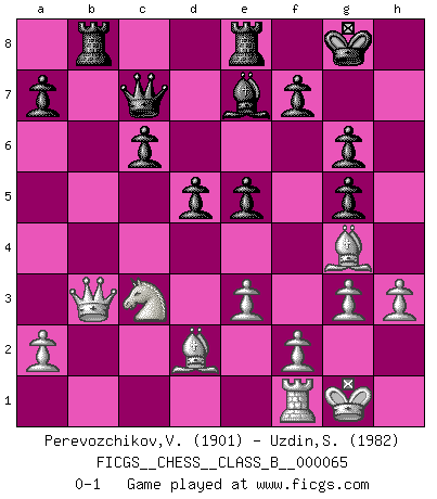Last move : 0-1 2009 January 15 1:56:53 [Event "FICGS__CHESS__CLASS_B__000065"] [Site "FICGS"] [Date "2008.12.20"] [Round "1"] [White "Perevozchikov,Vjacheslav"] [Black "Uzdin,Sergey"] [Result "0-1"] [WhiteElo "1901"] [BlackElo "1982"] 1.d4 d5 2.c4 c6 3.Nf3 Nf6 4.e3 Bf5 5.Nc3 e6 6.Nh4 Bg6 7.Nxg6 hxg6 8.Bd2 Nbd7 9.g3 Be7 10.c5 Qc7 11.b4 O-O 12.Be2 e5 13.O-O Rfe8 14.b5 Nf8 15.Qa4 Ne6 16.Rab1 g5 17.bxc6 bxc6 18.h3 g6 19.Rb3 Nd7 20.Bg4 Ndxc5 21.dxc5 Nxc5 22.Qa3 Nxb3 23.Qxb3 Rab8 0-1 QGD Slav : 4.e3 Bf5 Kingside Castling by player Black (move 11) Kingside Castling by player White (move 13) Player Black won this chess game. Follow this game move after move (download)Before the endgame, the Gods have placed the middle game. (Siegbert Tarrasch) Ich spiele 70 Eröffnungssysteme. (Viktor Kortschnoi) Morphy probablemente fue el genio más grande de todos. (Bobby Fischer) Le jeu d'échecs est comme rejeté hors du temps. (Antoine de Saint-Exupéry) If you lose the game you should win the analysis! (Proverb)