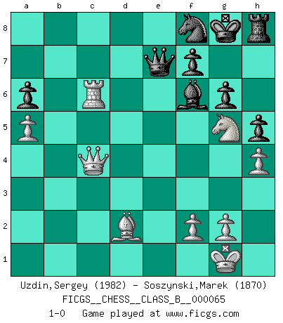 Last move : 1-0 2008 December 27 0:59:53 [Event "FICGS__CHESS__CLASS_B__000065"] [Site "FICGS"] [Date "2008.12.20"] [Round "1"] [White "Uzdin,Sergey"] [Black "Soszynski,Marek"] [Result "1-0"] [WhiteElo "1982"] [BlackElo "1870"] 1.e4 c6 2.d4 d5 3.e5 g6 4.c4 Bg7 5.Nc3 Be6 6.cxd5 Bxd5 7.Nxd5 Qxd5 8.Nf3 e6 9.Qc2 Nd7 10.Bc4 Qa5+ 11.Bd2 Qc7 12.h4 Nh6 13.a4 Nf5 14.Be2 h5 15.a5 a6 16.O-O c5 17.b4 Nxd4 18.Nxd4 Qxe5 19.Nf3 Qxe2 20.Rae1 Qb5 21.Rxe6+ Kf8 22.Rd6 Kg8 23.Re1 Nf8 24.Ng5 Re8 25.Rxe8 Qxe8 26.bxc5 Qe7 27.Qc4 Bf6 28.c6 bxc6 29.Rxc6 1-0 Caro-Kann : Advance variation Kingside Castling by player White (move 16) Player White won this chess game. Follow this game move after move (download)I like to say that Bobby Fischer was the greatest player ever. But what made Fischer a genius was his ability to blend an American freshness and pragmatism with Russian ideas about strategy. (Bruce Pandolfini) Der beste Spieler in einem Turnier gewinnt es nie. Er landet auf Platz zwei oder drei. (Siegbert Tarrasch) El Ajedrez, como cualquier actividad creativa, solo puede existir a través del esfuerzo combinado de aquellos que tienen talento creativo y de aquellos que poseen la habilidad de organizar su trabajo creativo. (Mikhail Botvinnik) Vous m'avez demandé de vous exposer quel est le fondement de la prière. Je ne fais que préparer les pièces du jeu sur la table... Nous sera-t-il permis d'en adopter les règles et si nous les appliquons scrupuleusement nous ne tarderons pas à faire mat le Roi divin ! Il ne pourra échapper à nos mains. (Sainte Thérèse d'Avila, Chemin de perfection) He who laughs last probably does not get the joke. (Unknown)