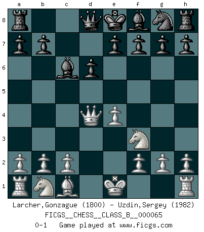 Last move : 0-1 2009 February 2 20:26:16 [Event "FICGS__CHESS__CLASS_B__000065"] [Site "FICGS"] [Date "2008.12.20"] [Round "1"] [White "Larcher,Gonzague"] [Black "Uzdin,Sergey"] [Result "0-1"] [WhiteElo "1800"] [BlackElo "1982"] 1.e4 c5 2.Nf3 d6 3.d4 cxd4 4.Qxd4 Nc6 5.Bb5 Bd7 6.Bxc6 Bxc6 0-1 This chess game has been lost on time (started : 2008.12.20 0:39:16) Sicilian, Chekhover variation Player Black won this chess game. Follow this game move after move (download)Help your pieces so they can help you. (Paul Morphy) Wenn du auf das Glück wartest, wird das Leben ziemlich langweilig. (Mikhail Nekhemyevich Tal) El Ajedrez expande y enriquece tu mente. (Saudin Robovic) Demandez au pauvre Cg1 ce qu'il en pense. Eduard Gufeld à propos de la variante Saemisch de l'Est-Indienne. Life is like a game of cards: the hand you are dealt represents determinism; the way you play it is free will. (Jawaharlal Nehru)