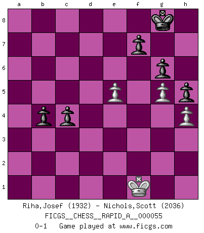 Last move : 0-1 2008 December 27 16:7:7 [Event "FICGS__CHESS__RAPID_A__000055"] [Site "FICGS"] [Date "2008.12.20"] [Round "1"] [White "Riha,Josef"] [Black "Nichols,Scott"] [Result "0-1"] [WhiteElo "1932"] [BlackElo "2036"] 1.d4 d5 2.c4 c6 3.Nc3 Nf6 4.cxd5 cxd5 5.Nf3 Nc6 6.Bf4 Bf5 7.e3 e6 8.Bd3 Bxd3 9.Qxd3 Bd6 10.Bxd6 Qxd6 11.O-O h6 12.Nb5 Qe7 13.Rac1 a6 14.Nc3 O-O 15.Na4 Rac8 16.a3 Na5 17.Ne5 b5 18.Nc5 Nc4 19.b4 a5 20.f4 axb4 21.axb4 Ra8 22.Ra1 Qc7 23.Qe2 Ra7 24.g4 Nh7 25.Rxa7 Qxa7 26.Nc6 Qc7 27.Ne5 Ra8 28.Re1 Ra3 29.Qf2 Nf6 30.h3 Ne4 31.Nxe4 Nxe5 32.fxe5 dxe4 33.Rf1 Ra7 34.h4 Qc3 35.g5 h5 36.Kg2 Qxb4 37.Qc2 g6 38.Kg3 Ra3 39.Kf4 Rc3 40.Qa2 Rb3 41.Qc2 Qa3 42.Qc1 Qa2 43.Kg3 Qa7 44.Kf4 b4 45.Qc8+ Kg7 46.Qd8 Rb2 47.Qf6+ Kg8 48.Qd8+ Kh7 49.Kg3 Re2 50.Qf6 Rxe3+ 51.Kg2 Rf3 52.Rxf3 exf3+ 53.Qxf3 Qa2+ 54.Kf1 Kg8 55.d5 Qc4+ 56.Qe2 exd5 57.Qxc4 dxc4 0-1 QGD Slav defense Kingside Castling by player White (move 11) Kingside Castling by player Black (move 14) 10 pieces endgame at move 57 : White KPPP , Black KPPPPP WHITE : King + 3 Pawns BLACK : King + 5 Pawns Player Black won this chess game. Follow this game move after move (download)That's what Chess is all about. One day you give your opponent a lesson, the next day he gives you one. (Bobby Fischer) Schach ist ein schwarz-weisser Dschungel. (Garry Kasparov) Tu cuerpo tiene que estar en óptima condición. Tu Ajedrez se deteriora como lo hace tu cuerpo. No puedes separar la mente y el cuerpo. (Bobby Fischer) RxDa4 pat (...) He who fights with monsters should be careful lest he thereby become a monster. (Friedrich Nietzsche, Beyond Good and Evil)
