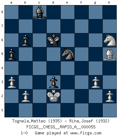 Last move : 1-0 2009 January 21 21:30:6 [Event "FICGS__CHESS__RAPID_A__000055"] [Site "FICGS"] [Date "2008.12.20"] [Round "1"] [White "Tognela,Matteo"] [Black "Riha,Josef"] [Result "1-0"] [WhiteElo "1935"] [BlackElo "1932"] 1.Nf3 c5 2.c4 Nc6 3.d4 cxd4 4.Nxd4 g6 5.e4 Bg7 6.Be3 Nf6 7.Nc3 O-O 8.Be2 b6 9.f4 Nxd4 10.Bxd4 Bb7 11.Qd3 d6 12.O-O Re8 13.f5 Nd7 14.Rac1 Bxd4+ 15.Qxd4 Ne5 16.Qd2 Kh8 17.Nd5 gxf5 18.exf5 Rg8 19.Rc3 e6 20.Qh6 Qg5 21.Qxg5 Rxg5 22.fxe6 fxe6 23.Nf4 Rf8 24.g3 Rf6 25.Ra3 a5 26.Rb3 Nd7 27.Rf2 h6 28.Rd3 d5 29.cxd5 exd5 30.Re3 Re5 31.Rxe5 Nxe5 32.Bh5 Kg8 33.Rd2 Rd6 34.Re2 Nc6 35.Kf2 d4 36.a3 d3 37.Re8+ Kg7 38.Ke1 Ba6 39.Kd2 Kf6 40.Rf8+ Ke7 41.Rf7+ Kd8 42.Rf5 Kc7 43.Rd5 Rxd5 44.Nxd5+ Kd6 45.Nf6 Ne5 46.Ng8 Bc8 47.Nxh6 1-0 Reti Opening Kingside Castling by player Black (move 7) Kingside Castling by player White (move 12) Player White won this chess game. Follow this game move after move (download)The beauty of a move lies not in its' appearance but in the thought behind it. (Siegbert Tarrasch) Smyslow ist ein Beweis dafür, dass ich noch zehn Jahre spielen kann! [der 75 jährige über den 85 jährigen] (Viktor Kortschnoi) El Ajedrez es de 30 a 40 por ciento psicología. Uno no cuenta con esto cuando se juega contra una computadora. No lo puedo confundir. (Judith Polgar) Les Echecs représentent une sphère d'idées créatrices basée sur la volonté des deux protagonistes. (Smyslov) Never risk one's whole fortune unless supported by one's entire army. (Niccolo Machiavelli)