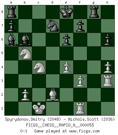 Last move : 0-1 2009 February 17 9:16:40 [Event "FICGS__CHESS__RAPID_A__000055"] [Site "FICGS"] [Date "2008.12.20"] [Round "1"] [White "Spyrydonov,Dmitry"] [Black "Nichols,Scott"] [Result "0-1"] [WhiteElo "2048"] [BlackElo "2036"] 1.d4 d5 2.c4 c6 3.Nc3 Nf6 4.Nf3 e6 5.Bg5 h6 6.Bh4 dxc4 7.e4 g5 8.Bg3 b5 9.h4 g4 10.Ne5 Bb4 11.f3 Rg8 12.a3 Ba5 13.Bf4 gxf3 14.gxf3 Bb6 15.a4 Bxd4 16.Qd2 Nh5 17.O-O-O Bb6 18.axb5 Qxd2+ 19.Bxd2 Ng3 20.Rh3 Nxf1 21.Rxf1 Nd7 22.Nxc4 cxb5 23.Nxb5 Ba6 0-1 This chess game has been lost on time (started : 2008.12.20 16:33:17) QGD Slav defense Queenside Castling by player White (move 17) Player Black won this chess game. Follow this game move after move (download)By this measure (on the gap between Fischer & his contemporaries), I consider him the greatest world champion. (Garry Kasparov) Wir können eben der zündenden Macht des Opfers nicht wiederstehen, denn die Begeisterung für das Opfer liegt in der Natur des Menschen. (Rudolf Spielmann) A la fecha, Fischer esta simplemente un nivel arriba de todos los mejores jugadores de Ajedrez del mundo. (John Jacobs) Je crois qu'il existe des manières très spécifiques de jouer efficacement contre une machine. Evidemment, nous n'avons aucune chance en technique pure, parce que l'ordinateur calcule de manière parfaite. Mais lorsque nous faisons appel à notre cerveau, en utilisant l'intuition et la compréhension, alors nous restons beaucoup plus forts. (Anatoli Karpov) . 'gn is not allowed in chess unless n is an integer between 1 and 8 inclusive, where 1 and 8 are to interpreted as the standard numerals standing for integers in the ordered real-closed field R, with the *canonical* ordering. (As opposed to, say, an integer in the domain Z[2+i*sqrt(5)] or an integer in some exotic Grothendieck topos). (Normajean Yates)