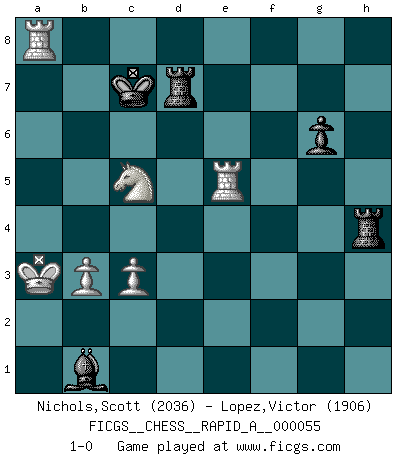 Last move : 1-0 2009 March 6 22:17:48 [Event "FICGS__CHESS__RAPID_A__000055"] [Site "FICGS"] [Date "2008.12.20"] [Round "1"] [White "Nichols,Scott"] [Black "Lopez,Victor"] [Result "1-0"] [WhiteElo "2036"] [BlackElo "1906"] 1.e4 c5 2.Nf3 e6 3.d4 cxd4 4.Nxd4 Nf6 5.Nc3 d6 6.g4 h6 7.h4 Nc6 8.Rg1 h5 9.gxh5 Nxh5 10.Bg5 Nf6 11.Rg3 a6 12.Nxc6 bxc6 13.Qf3 Qb6 14.O-O-O Rb8 15.b3 Nh5 16.Rg1 g6 17.Na4 Qc7 18.Qe3 Bg7 19.Kb1 a5 20.Be2 c5 21.Qd2 Bd4 22.c3 Be5 23.f4 Bg7 24.f5 exf5 25.Bxh5 Rxh5 26.Qxd6 Qxd6 27.Rxd6 Bb7 28.exf5 Be4+ 29.Kb2 Bxf5 30.Rgd1 f6 31.Bxf6 Bxf6 32.Rxf6 Ke7 33.Ra6 c4 34.Rd4 cxb3 35.axb3 Rd8 36.Ra7+ Ke8 37.Rc4 Rd5 38.Ka3 Bb1 39.Rc8+ Rd8 40.Rc5 Rxh4 41.Rcxa5 Rd7 42.Re5+ Kd8 43.Ra8+ Kc7 44.Nc5 1-0 This chess game has been lost on time (started : 2008.12.20 16:33:17) Sicilian : Anderssen variation Queenside Castling by player White (move 14) Player White won this chess game. Follow this game move after move (download)The only thing Chess players have in common is Chess. (Lodewijk Prins) Garry Kasparov war erst in der Großmeister-Organisation GMA, dann in der Profischach-Vereinigung PCA, zum Schluss kehrte er wieder in den Schoß der FIDE zurück. Aber gut, manche Leute sind flexibel (Viswanathan Anand) Las ideas audaces son como las piezas del Ajedrez que avanzan hacia adelante. Ellas pueden ser vencidas, pero también pueden iniciar una partida victoriosa. (Goethe) Les Echecs, c'est l'art de la guerre sans les charniers, c'est la résurrection des morts tombés au champ d'honneur, l'espoir perpétuel, la suprématie de l'intelligence sur la force, la culture de l'esprit. (F. Szpiner) You cannot beat a roulette table unless you steal money from it. (Albert Einstein)