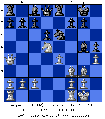 Last move : 1-0 2009 January 15 20:6:55 [Event "FICGS__CHESS__RAPID_A__000055"] [Site "FICGS"] [Date "2008.12.20"] [Round "1"] [White "Vasquez,Fernando"] [Black "Perevozchikov,Vjacheslav"] [Result "1-0"] [WhiteElo "1992"] [BlackElo "1901"] 1.e4 e5 2.Nf3 d6 3.d4 exd4 4.Nxd4 Nf6 5.Nc3 Be7 6.Bf4 O-O 7.Be2 Re8 8.O-O Nc6 9.Qd2 Nxd4 10.Qxd4 Nd7 11.Nd5 Nc5 12.Bg3 Bg5 13.Bf3 h5 14.h4 Ne6 15.Qa4 1-0 Philidor : Exchange variation Kingside Castling by player Black (move 6) Kingside Castling by player White (move 8) Player White won this chess game. Follow this game move after move (download)You may learn much more from a game you lose than from a game you win. You will have to lose hundreds of games before becoming a good player. (Jose Raul Capablanca) Wenn du gegen Bobby spielst, ist es keine Frage von gewinnen oder verlieren. Es ist eine Frage des Überlebens. (Boris Vassilievich Spassky) Morphy probablemente fue el genio más grande de todos. (Bobby Fischer) Votre prénom est 'Tactique', votre deuxième prénom est 'Tactique' et votre nom est 'Tactique'. (Ken Smith) Art disturbs, science reassures. (Georges Braque, Le Jour et la Nuit)