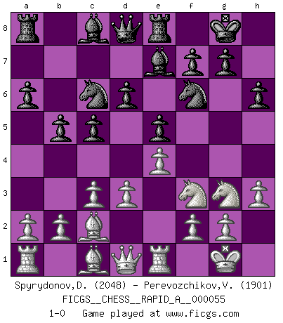 Last move : 1-0 2009 January 18 16:46:25 [Event "FICGS__CHESS__RAPID_A__000055"] [Site "FICGS"] [Date "2008.12.20"] [Round "1"] [White "Spyrydonov,Dmitry"] [Black "Perevozchikov,Vjacheslav"] [Result "1-0"] [WhiteElo "2048"] [BlackElo "1901"] 1.e4 e5 2.Nf3 Nc6 3.Bb5 a6 4.Ba4 Nf6 5.O-O Be7 6.d3 b5 7.Bb3 d6 8.c3 O-O 9.Nbd2 Na5 10.Bc2 c5 11.Re1 Nc6 12.Nf1 Re8 13.h3 h6 14.Ng3 1-0 Ruy Lopez : Closed defense Kingside Castling by player White (move 5) Kingside Castling by player Black (move 8) Player White won this chess game. Follow this game move after move (download)The passed Pawn is a criminal, who should be kept under lock and key. Mild measures, such as police surveillance, are not sufficient. (Aaron Nimzovich) Kleine Schachspieler machen Mist, und große Schachspieler machen Mist, aber große machen weniger Mist. (Fritz Sämisch) Cuando veas una buena jugada, trata de encontrar otra mejor. (Emanuel Lasker) Le jeu d'échecs est comme rejeté hors du temps. (Antoine de Saint-Exupéry) When you've done things right people won't know you've done anything at all. (Futurama)