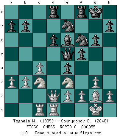 Last move : 1-0 2009 February 14 9:7:46 [Event "FICGS__CHESS__RAPID_A__000055"] [Site "FICGS"] [Date "2008.12.20"] [Round "1"] [White "Tognela,Matteo"] [Black "Spyrydonov,Dmitry"] [Result "1-0"] [WhiteElo "1935"] [BlackElo "2048"] 1.Nf3 f5 2.g3 Nf6 3.Bg2 g6 4.O-O Bg7 5.d4 O-O 6.b3 Ne4 7.Bb2 c5 8.Qc1 cxd4 9.Bxd4 Bxd4 10.Nxd4 e5 11.Nf3 Nc6 12.c4 Qa5 13.a3 d6 14.Nfd2 Nf6 15.Nc3 e4 16.Rd1 Be6 17.Nf1 Qe5 18.Qd2 Rad8 19.Ne3 Ne7 20.Rac1 1-0 This chess game has been lost on time (started : 2008.12.20 16:33:17) Reti v Dutch Kingside Castling by player White (move 4) Kingside Castling by player Black (move 5) Player White won this chess game. Follow this game move after move (download)You cannot play at Chess if you are kind-hearted. (French Proverb) Ein Springer auf f6 gegen die eigene Rochadestellung ist schlimmer als ein rostiger Nagel im Knie. (Efim Bogoljubov) Si no le temes a Spassky, entonces elimino el elemento del dinero. (Jim Slater) Que feriez-vous si vous étiez en train de jouer aux échecs et que la fin du monde arrive ? Je continuerais à jouer. (Saint Borromée) I would love to change the world, but they won't give me the source code. (Unknown)