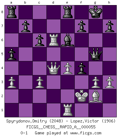 Last move : 0-1 2009 April 1 1:39:39 [Event "FICGS__CHESS__RAPID_A__000055"] [Site "FICGS"] [Date "2008.12.20"] [Round "1"] [White "Spyrydonov,Dmitry"] [Black "Lopez,Victor"] [Result "0-1"] [WhiteElo "2048"] [BlackElo "1906"] 1.c4 e5 2.Nc3 Nf6 3.Nf3 Nc6 4.d4 exd4 5.Nxd4 Bb4 6.g3 O-O 7.Bg2 Re8 8.O-O Bxc3 9.bxc3 Ne5 10.Qb3 d6 11.Rd1 Nfd7 12.Ba3 a5 13.Nf5 Ng4 14.h3 Nxf2 15.Kxf2 Qf6 16.e4 g6 17.c5 Nxc5 18.Bxc5 dxc5 19.Qb5 c6 20.Qxc5 gxf5 21.Rd6 Qe7 22.Re1 Be6 23.Qd4 f4 24.a3 Qg5 0-1 This chess game has been lost on time (started : 2008.12.20 16:33:17) English Opening Kingside Castling by player Black (move 6) Kingside Castling by player White (move 8) Player Black won this chess game. Follow this game move after move (download)Fischer is an American Chess tragedy on par with Morphy and Pillsbury. (Mig Greengard) Oft bringt ein stiller Zug das Erdbeben. (Richard Reti) Entre mas años cumplo, mas valoro los Peones. (Keres) Il a essayé de se convaincre qu'il pourrait empêcher toutes les erreurs et ne jamais perdre. L'horreur ! Gary Kasparov au sujet de Robert Fischer. Wikichess, chess moves explained by 'experimented' players. (Thibault de Vassal)
