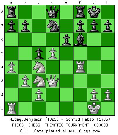 Last move : 0-1 2006 November 22 8:47:18 [Event "FICGS__CHESS__THEMATIC_TOURNAMENT__000008"] [Site "FICGS"] [Date "2006.08.22"] [Round "1"] [White "Aldag,Benjamin"] [Black "Schmid,Pablo"] [Result "0-1"] [WhiteElo "1822"] [BlackElo "1736"] 1.d4 d5 2.e4 dxe4 3.Nc3 Nf6 4.f3 exf3 5.Nxf3 Bf5 6.Bd3 Bxd3 7.Qxd3 c6 8.O-O e6 9.Bf4 Nbd7 10.Nd2 Be7 11.Nc4 O-O 12.a4 Nd5 13.b3 Nxf4 14.Rxf4 c5 15.d5 Bf6 0-1 Blackmar gambit Kingside Castling by player White (move 8) Kingside Castling by player Black (move 11) Player Black won this chess game. Follow this game move after move (download)All that matters on the Chessboard is good moves. (Bobby Fischer) Ich tröste mich mit dem Vergnügen, daß Schachfans, Zuschauer und Leser glücklich sind, wenn ein Großmeister etwas riskiert, statt nur Klötzchen zu schieben. (Mikhail Nekhemyevich Tal) Aquel que ve no otra dirección en el juego que la de dar Jaque Mate a su oponente, nunca será un buen jugador de Ajedrez. (Euwe) Horreur, mais aussi harmonie suprême : qu'y avait-il en effet au monde en dehors des échecs ? Le brouillard, l'inconnu, le non-être... (Vladimir Nabokov) It's unlucky to be superstitious. (Dave Enteles)