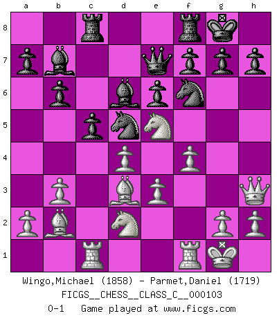 Last move : 0-1 2009 May 1 16:37:15 [Event "FICGS__CHESS__CLASS_C__000103"] [Site "FICGS"] [Date "2008.12.23"] [Round "1"] [White "Wingo,Michael"] [Black "Parmet,Daniel"] [Result "0-1"] [WhiteElo "1858"] [BlackElo "1719"] 1.d4 d5 2.c4 c6 3.Nf3 e6 4.e3 Nf6 5.b3 Nbd7 6.Bb2 Bd6 7.Nbd2 O-O 8.Bd3 b6 9.O-O Bb7 10.Ne5 Qc7 11.f4 c5 12.Rc1 Rac8 13.cxd5 Nxd5 14.Qh5 N7f6 15.Qh3 Qe7 0-1 This chess game has been lost on time (started : 2008.12.23 16:53:32) QGD Slav : 3.Nf3 Kingside Castling by player Black (move 7) Kingside Castling by player White (move 9) Player Black won this chess game. Follow this game move after move (download)Good positions don't win games, good moves do. (Gerald Abrahams) Schach ist mein Leben, meine Leidenschaft, was ich gelernt habe und seit meinem 14. Lebensjahr profimässig praktiziere. Darauf zu verzichten, würde mir sehr schwer fallen. (Viktor Kortschnoi) Con el tiempo, empecé a progresar en partidas decisivas. Tal vez porque me di cuenta de una simple verdad: no solo estaba yo nervioso sino también mi oponente. (Mikhail Tal) En blitz, le Cavalier l'emporte sur le Fou. (Vlastimil Hort) He who laughs last probably does not get the joke. (Unknown)