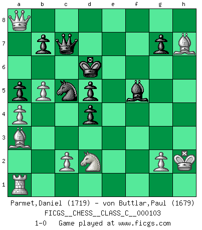 Last move : 1-0 2009 May 12 20:6:14 [Event "FICGS__CHESS__CLASS_C__000103"] [Site "FICGS"] [Date "2008.12.23"] [Round "1"] [White "Parmet,Daniel"] [Black "von Buttlar,Paul"] [Result "1-0"] [WhiteElo "1719"] [BlackElo "1679"] 1.e4 e6 2.d4 d5 3.e5 c5 4.b4 cxd4 5.a3 Nc6 6.f4 a5 7.b5 Nxe5 8.fxe5 Qh4+ 9.Ke2 Qe4+ 10.Kf2 Qxe5 11.Nf3 Qc7 12.Bd3 Nf6 13.Re1 Bd6 14.Kg1 O-O 15.Qe2 Re8 16.Ne5 Nd7 17.Bxh7+ Kf8 18.Nxf7 Bxh2+ 19.Kh1 Kxf7 20.Qh5+ Ke7 21.Rxe6+ Kxe6 22.Qxe8+ Kd6 23.a4 Nc5 24.Kxh2 Ne6 25.Ba3+ Nc5 26.Nd2 Bf5 27.Qxa8 1-0 French : Advance variation Kingside Castling by player Black (move 14) Player White won this chess game. Follow this game move after move (download)Chess mastery essentially consists of analyzing Chess positions accurately. (Mikhail Botvinnik) Man kann eine Schachpartie nur gewinnen, wenn das Gleichgewicht gestört ist. In einer Stellung mit ungestörtem Gleichgewicht ist auch das größte Genie hilflos - in der Stellung steckt dann eben kein genialer Einfall. (Wilhelm Steinitz) El Ajedrez hace al hombre ser mas sabio y ver mas claro. (Vladimir Putin) J'apprécie les joueurs d'est-indienne, c'est grâce à eux que je nourris ma famille depuis tant d'années. (Petrosian) I'll be back. (Arnold Schwarzenegger)