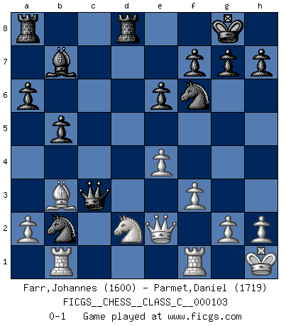 Last move : 0-1 2009 January 14 0:25:2 [Event "FICGS__CHESS__CLASS_C__000103"] [Site "FICGS"] [Date "2008.12.23"] [Round "1"] [White "Farr,Johannes"] [Black "Parmet,Daniel"] [Result "0-1"] [WhiteElo "1600"] [BlackElo "1719"] 1.d4 d5 2.c4 c6 3.Nf3 e6 4.Bg5 Be7 5.Bxe7 Qxe7 6.e3 Nf6 7.Nc3 O-O 8.Rc1 b6 9.Be2 dxc4 10.Bxc4 Nbd7 11.O-O Bb7 12.Nd2 c5 13.dxc5 Nxc5 14.f3 Rfd8 15.e4 a6 16.Qe2 b5 17.Bb3 Nd3 18.Rcd1 Nxb2 19.Rb1 Qc5+ 20.Kh1 Qxc3 0-1 QGD Slav : 3.Nf3 Kingside Castling by player Black (move 7) Kingside Castling by player White (move 11) Player Black won this chess game. Follow this game move after move (download)The tactician knows what to do when there is something to do; whereas the strategian knows what to do when there is nothing to do. (Gerald Abrahams) Wenn ich gewinne bin ich ein Genie. Wenn nicht, dann bin ich keines. (Robert James Fischer) El Ajedrez es tan interesante por sí solo, que no es necesario un interés monetario para persuadir a una persona a que lo practique; por lo tanto, nunca se juega por dinero. (Benjamin Franklin) La conception d'un plan est le processus par lequel un joueur exploite les avantages de sa position tout en s'efforçant d'en réduire au minimum les inconvénients. Afin de garantir le succès, un plan doit toujours se fonder sur un diagnostic objectif des particularités d'une position. La conception d'un plan est d'autant plus difficile que la position est équilibrée, et grandement facilitée lorsqu'il n'existe qu'un seul plan susceptible de répondre aux exigences de la position. (Harry Golombek) Creativity involves breaking out of established patterns in order to look at things in a different way. (Edward De Bono)