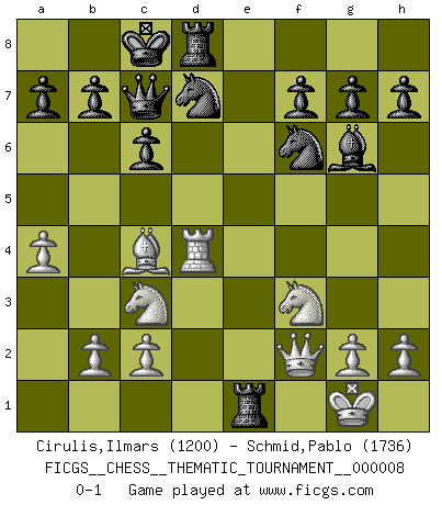 Last move : 0-1 2006 December 6 16:9:27 [Event "FICGS__CHESS__THEMATIC_TOURNAMENT__000008"] [Site "FICGS"] [Date "2006.08.22"] [Round "1"] [White "Cirulis,Ilmars"] [Black "Schmid,Pablo"] [Result "0-1"] [WhiteElo "1200"] [BlackElo "1736"] 1.d4 d5 2.e4 dxe4 3.Nc3 Nf6 4.f3 exf3 5.Nxf3 c6 6.Bc4 Bf5 7.O-O e6 8.Bf4 Bd6 9.Nh4 Bg6 10.Qd2 Bxf4 11.Rxf4 Nbd7 12.Re1 Qc7 13.Nf3 O-O-O 14.a4 e5 15.Rh4 Rhe8 16.Qf2 exd4 17.Rxd4 Rxe1+ 0-1 Blackmar gambit Kingside Castling by player White (move 7) Queenside Castling by player Black (move 13) Player Black won this chess game. Follow this game move after move (download)A chess genius has died; a loss for humanity. (Viktor Kortchnoi, about Bobby Fischer's death) Ich erzeugte keinen Neid, da mich die Schachspieler als Musiker und die Musiker als Schachspieler betrachteten. (Mark Taimanov) La batalla por la última verdad nunca sera ganada. Y es por eso que el Ajedrez es tan fascinante. (Hans Kmoch) J'apprécie les joueurs d'est-indienne, c'est grâce à eux que je nourris ma famille depuis tant d'années. (Petrosian) No man has ever achieved immortality in his own life time. (Unknown)